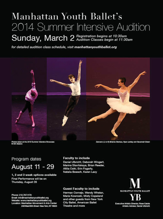 Manhattan Youth Ballet and Manhattan Movement & Arts Center announce the 2014 Summer Intensive Auditions on Sunday, March 2, 2014. Registration begins at 10:30am with audition classes for ages 8-10 at 11:30am, ages 11-14 at 12:30pm, and ages 15 and up at 1:45pm, at the Manhattan Movement & Arts Center, 248 West 60th Street, NYC (between Amsterdam and West End Avenues) in the Lincoln Center area. The audition application and further information is available at www.manhattanyouthballet.org. Audition fee is $30 payable by cash, check or credit card.