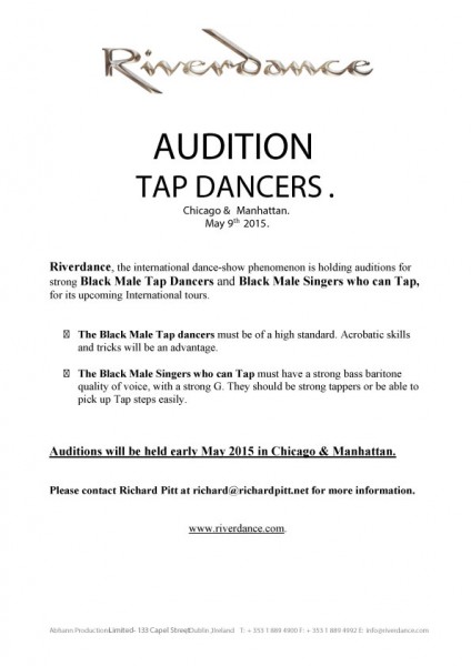 Riverdance, the international dance-show phenomenon is holding auditions for strong Black Male Tap Dancers and Black Male Singers who can Tap, for its upcoming International tours.