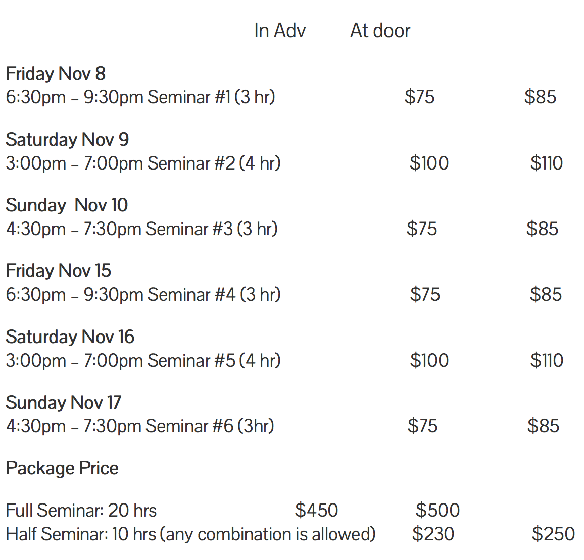 Classes are November 8, 9, 10 and 15, 16 & 17.