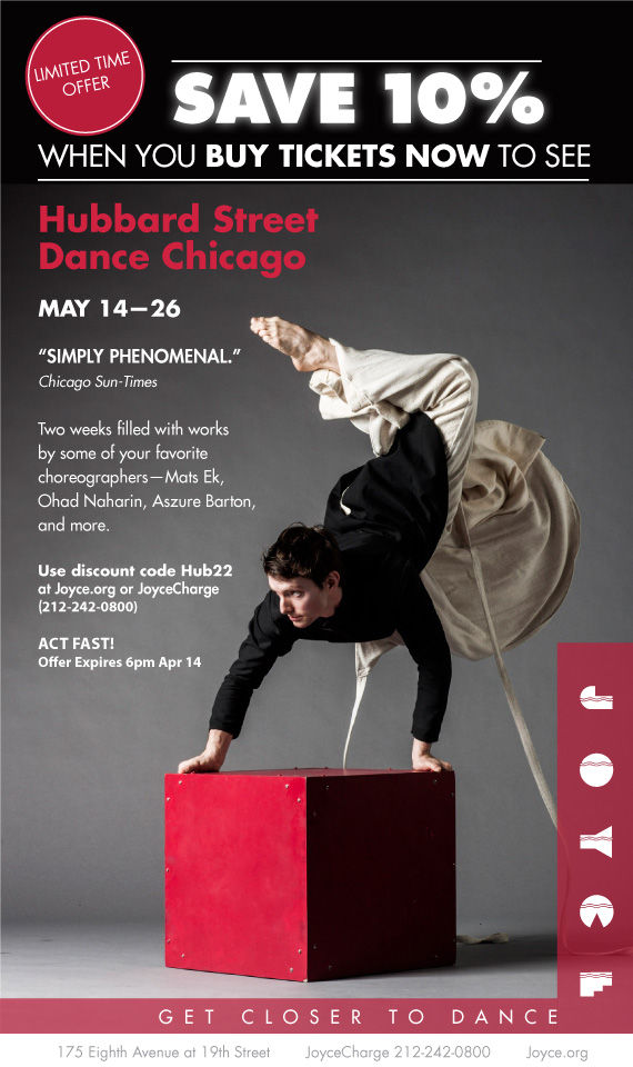 Use code "HUB22" for discount at Joyce.org or when calling JoyceCharge (212-242-0800). Offer applies to section A tickets only. Subject to availability. Limit four tickets per transaction. No refunds or exchanges. Not valid in combination with any other offer or for prior sales. Offer expires Sunday, April 14 at 6pm.