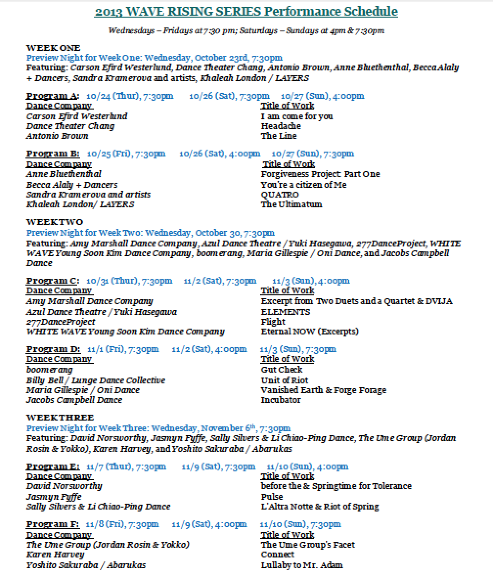 WHITE WAVE announces its 8th annual WAVE RISING SERIES featuring approximately 21 dance companies showcased in the acclaimed three week festival. Selected by a panel of esteemed presenters and dance artists in New York, a talented group of established and rising national and international dancemakers w ill appear in this year’s SERIES. The Festival (October 23 - November 10, 2013) will take place at WHITE WAVE John Ryan Theater, located at 25 Jay Street in DUMBO, Brooklyn. Tickets are $20 in advance and may be purchased at www.whitewavedance.com. Discount group tickets are available by contacting WHITE WAVE at wwyskdc@gmail.com, 2013wrs@gmail.com or 718.855.8822.