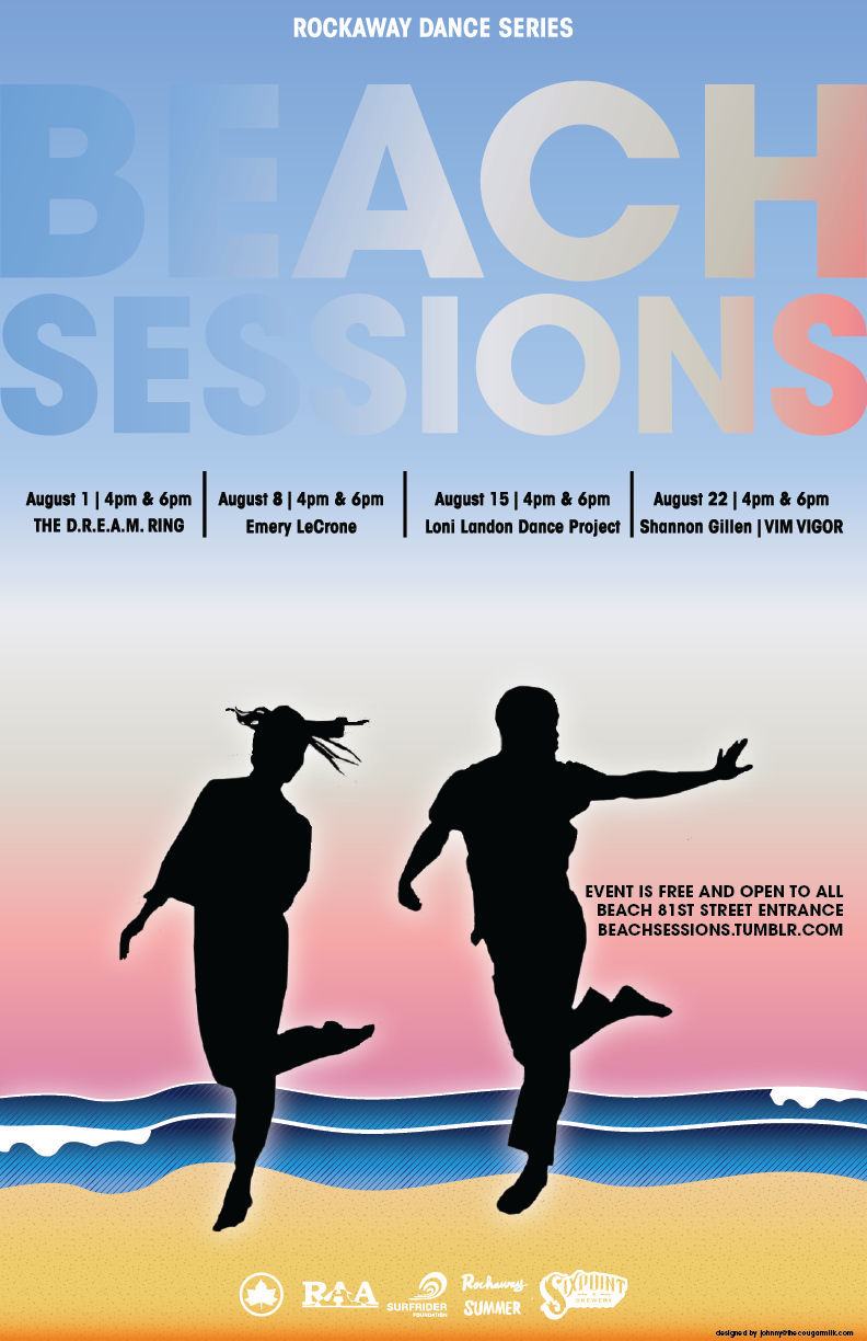 Rockaway Beach, Queens, NY, August 2015. Beach Sessions kicks off its inaugural season on August 1st and continues for four consecutive Saturdays with two free performances at 4pm and 6pm, through August 22nd, 2015. The season will feature a diverse program presenting new works by THE D.R.E.A.M RING, Emery LeCrone Dance, Loni Landon Dance Project and Shannon Gillen | VIM VIGOR. Please find a schedule with programming details below. The performances will take place on a 360 degree stage set right on the sand off of Beach 81st Street.