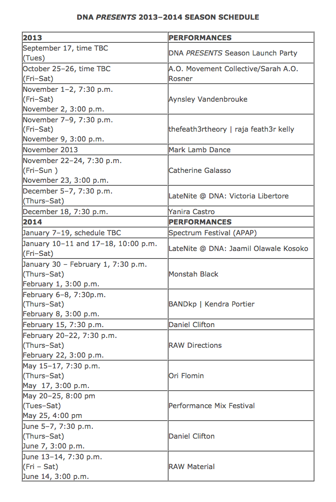 DNA PRESENTS 2013–2014 SEASON DETAILS (Full Schedule Follows)