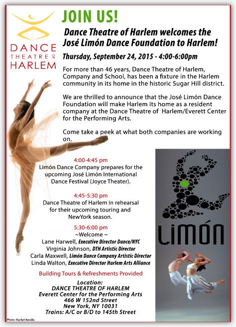 Dear Friend: Please join us for this event to celebrate the Limon Dance Foundation's move to Harlem, where it will join forces with Dance Theatre of Harlem. Transportation: if you are coming from Manhattan, take the A, B, C or D train (staying at the front of the train if you're coming from downtown) and exit on 147th Street & St. Nicholas. Continue on St. Nicholas to 152nd Street.