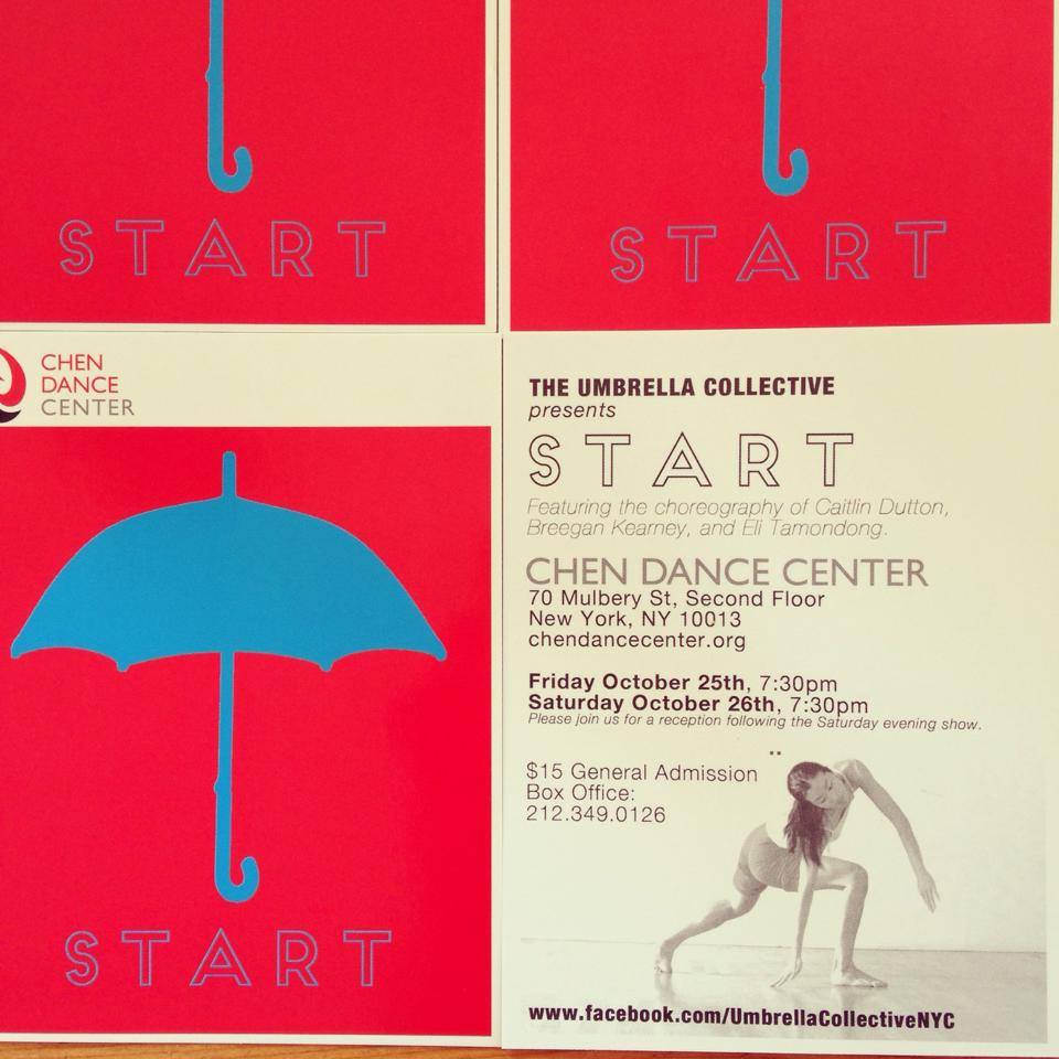 START! The Umbrella Collective is a group of three very talented choreographers, including our very own Breegan Kearney, who have banded together to produce their own work. What a brave and exciting endeavor! Come check out "START", their very first show, next weekend at the Chen Dance Center. Featuring the work of Breegan Kearney, Caitlin Dutton and Eli Tamondong.