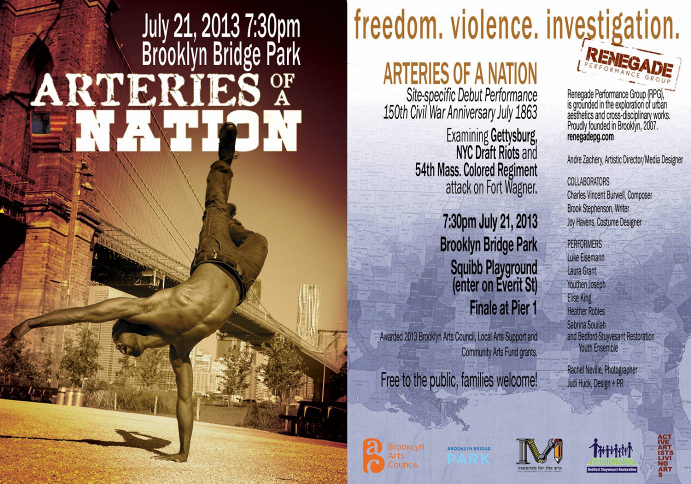 Renegade Performance Group (RPG) is a Brooklyn-based dance performance company, exploring urban artistic aesthetics and expressions through dance theatre, site-specific performance and technological media. In 2013 RPG was awarded both the Community Arts Fund & Local Arts Support grants from the Brooklyn Arts Council to support a new project -- a reinvestigative Civil War enactment/150th Anniversary of July 1863 events. This latest project entitled, “Arteries of a Nation,” embodies the Company’s new focus in developing performance works for site-specific locations, and incorporating digital media. More information about RPG and key collaborators can be found on the pages that follow.