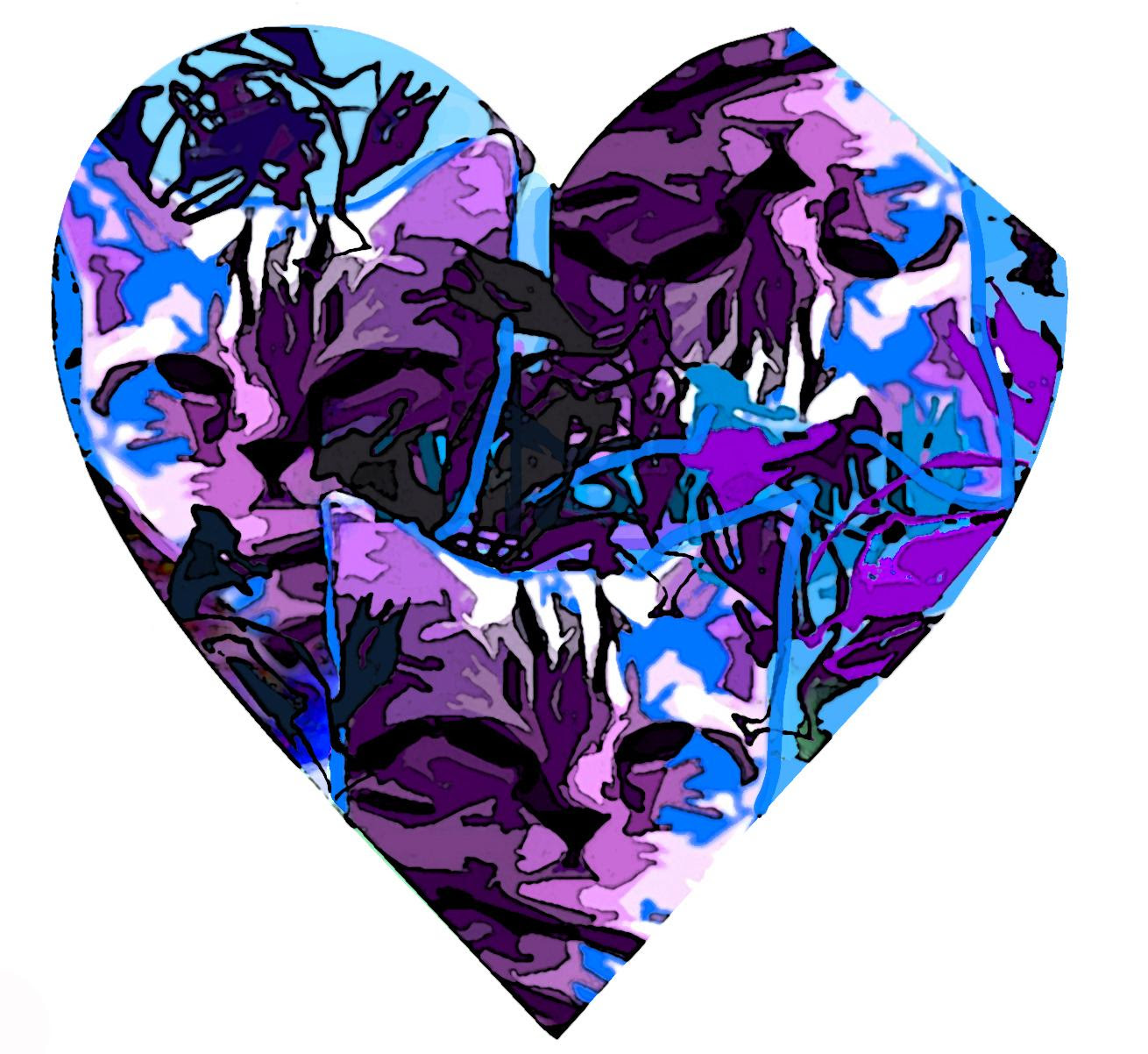 [Three cats peer out, intensely curious, soft, and wise. Black eyes and chiseled features inviting, calling us into their world. Their lavender, bright blue, and white bodies shine against the sky blue background. A bright blue line outlines each cat and one, yes, is that right? Yes, one is upside down. All three kitties live in a heart-shaped window with a chunk sliced off the right lobe.]