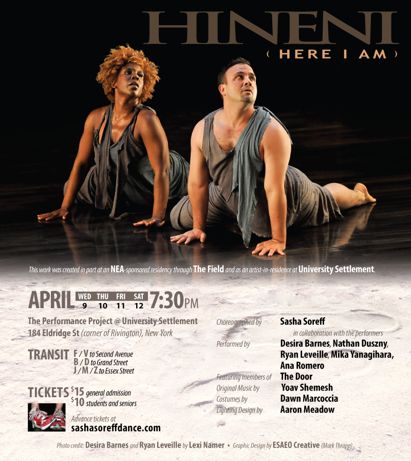 NEW YORK 3/18/14 -- The Performance Project @ University Settlement will present Hineni (Here I Am), a new dance performance from Sasha Soreff Dance Theater. The performance, which juxtaposes ancient stories of divine calling with our contemporary struggles to be present to the moments that define us, will run fromApril 9-12.