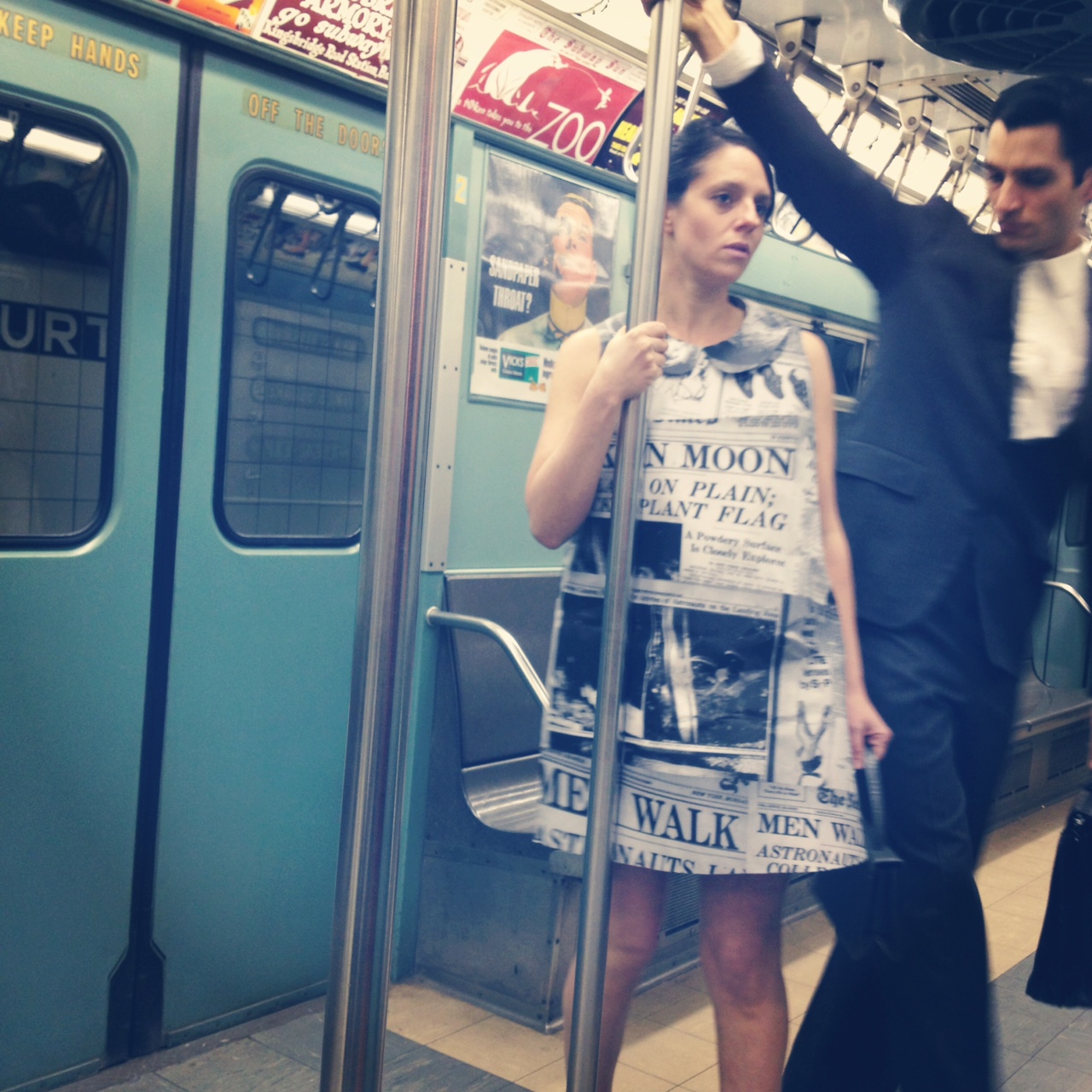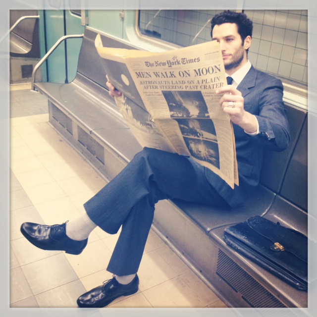 Surreal, Evocative, Historical, An immersive Dance-Theatre performance taking place in a 1963 subway car at the New York Transit Museum. A woman is costumed in a paper period dress made of newspaper from the day Neil Armstrong walked on the moon.