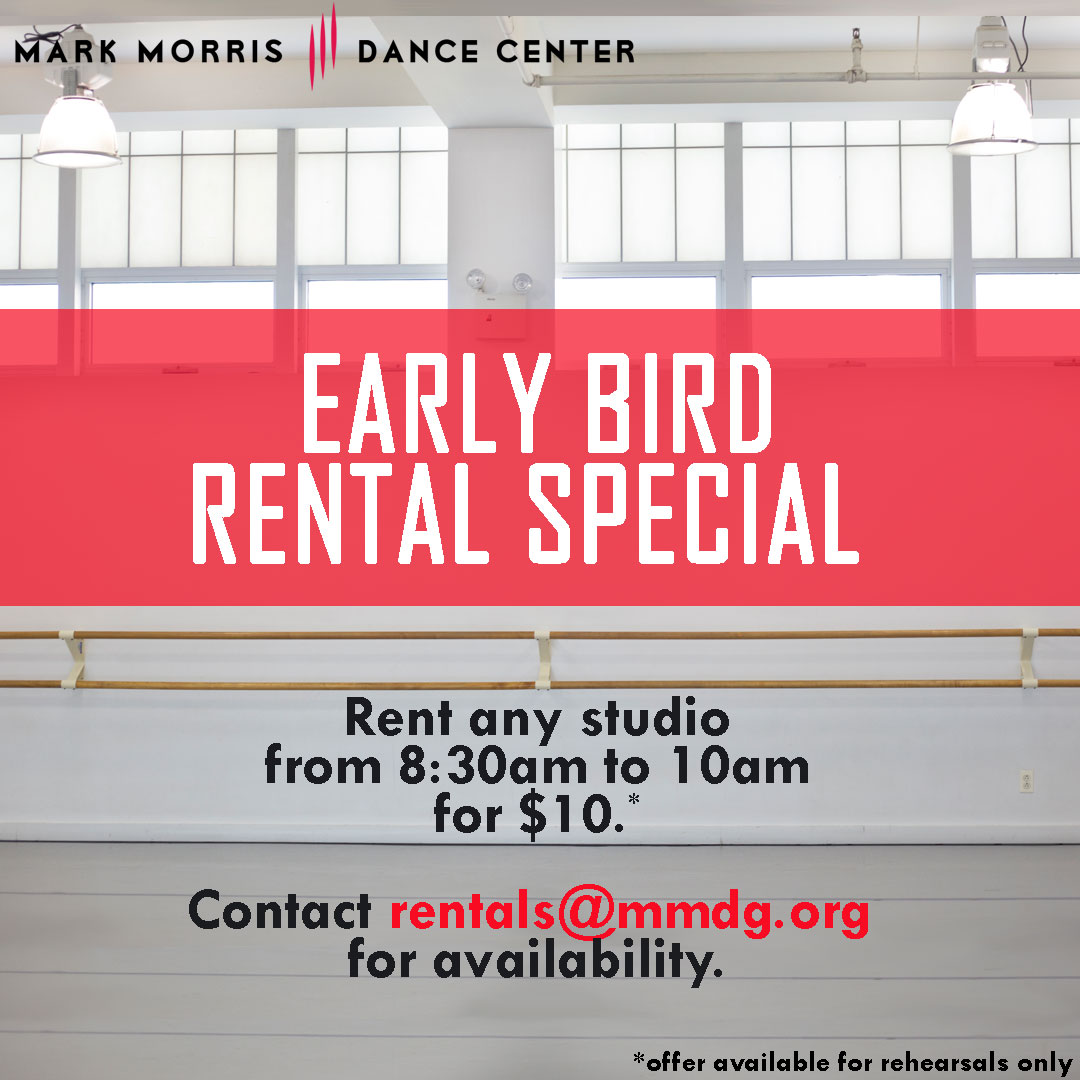 The Mark Morris Dance Center's studios and ancillary spaces are available for a variety of rentals, including rehearsals, workshops, auditions, showings, meetings, conferences, film and photo shoots, private parties, performances and events.