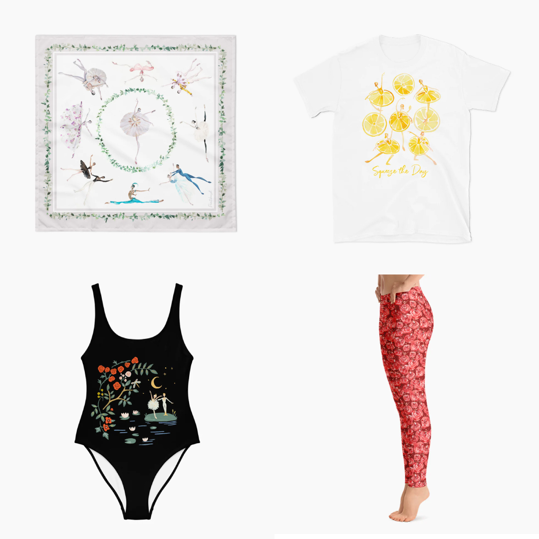 Clockwise from top left: Illustrated scarf, t-shirt, leggings, and swimsuit by Margot Hallac. Images © Pointebrush