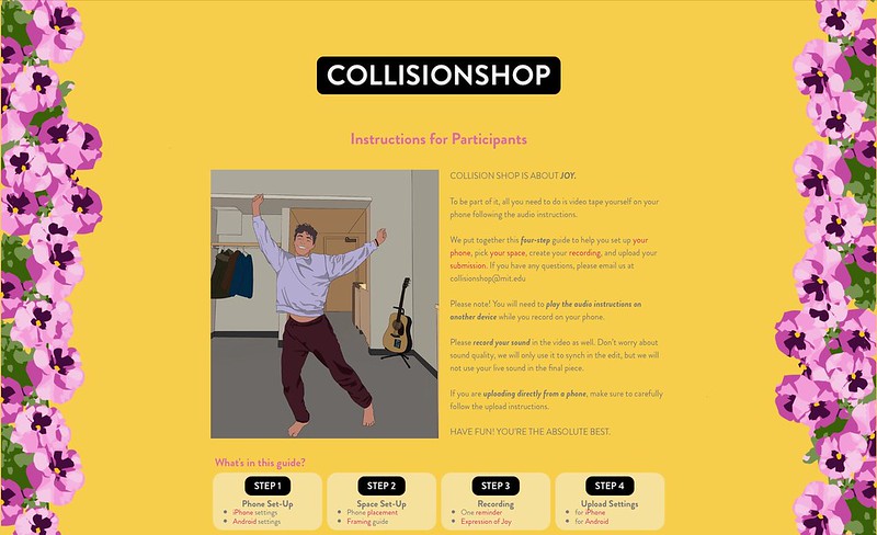 An MIT Theater Arts Spring Production COLLISION SHOP is a globally-crowdsourced multidisciplinary online exhibit, open to performers and non-performers alike. Its goal is to bring joy to people by inviting them to both take part in it and watch it. This collaborative project is based on and driven by ideas contributed by a diverse 13-member group of MIT students from various fields (from artists through computer engineers and chemists to cognitive scientists) whose unique sensibility and understanding of the world brought a new perspective to this performance-based work. COLLISION SHOP emerged through a series of Zoom workshops in which the MIT team was joined by four attendees of The Norwegian Theater Academy and a renegade dancer from Poland who was under lockdown in London. The work was facilitated by dance artist and MIT lecturer Dan Safer, in collaboration with performer and storyteller Wil Petre and dramaturg Ogemdi Ude.