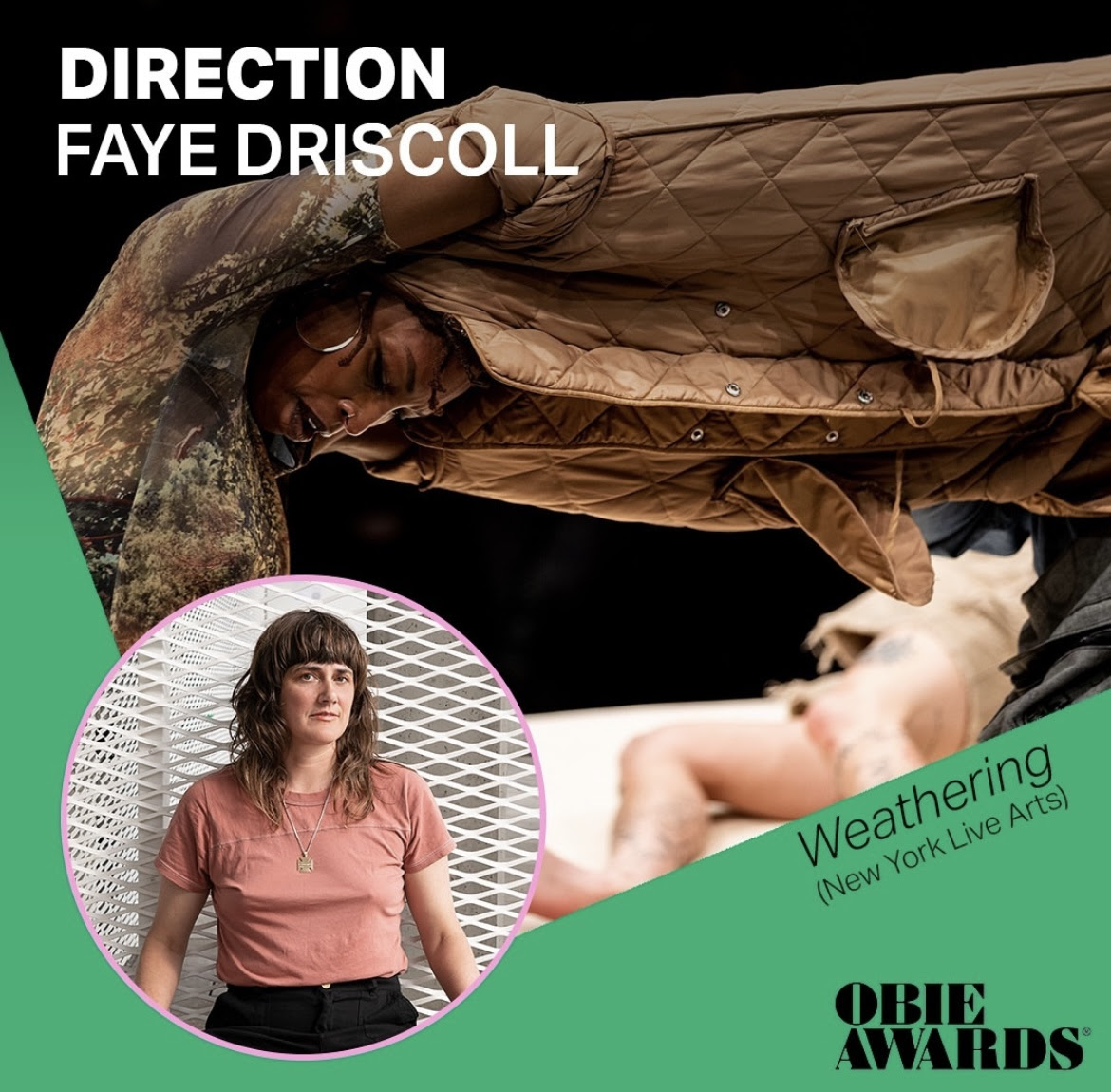 "Thank you to The American Theater Wing, The Obie Awards, and to the judges for this deep witnessing," responded Driscoll. "Special thank you to New York Live Arts and the Randjelović/Stryker Resident Commissioned Artist (RCA) program, and thank you from the depths of my guts to the Weathering team for creating this alive leaking howling world with me. I could not have made this work without your collaboration-presence- faith-love-risk-labor."