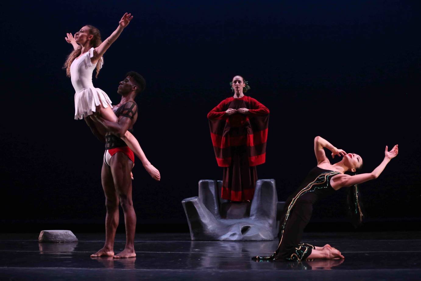Marzia Memoli, Lloyd Knight, Anne Souder and Xin Ying in Martha Graham’s Cave of the Heart; photo by Melissa Sherwood