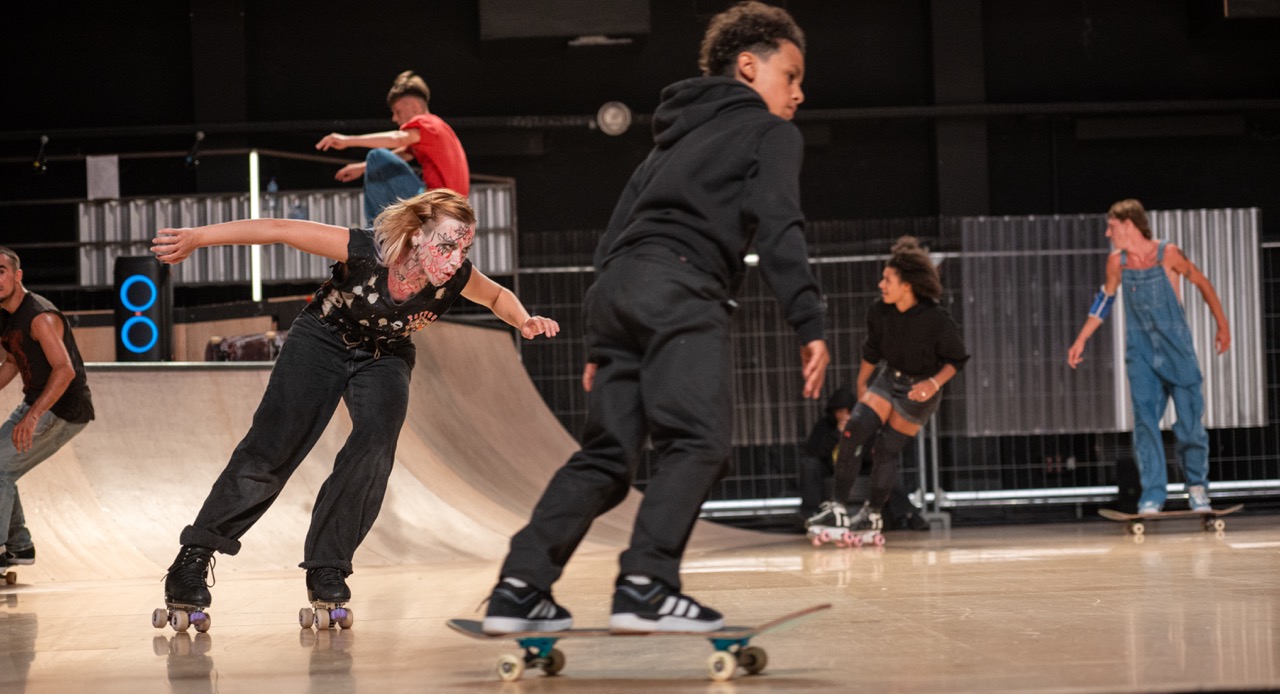 Mette Ingvartsen transforms Powerhouse Arts' Grand Hall into a space of friction, flow, and velocity—where skaters and dancers move together and carve out worlds of their own.