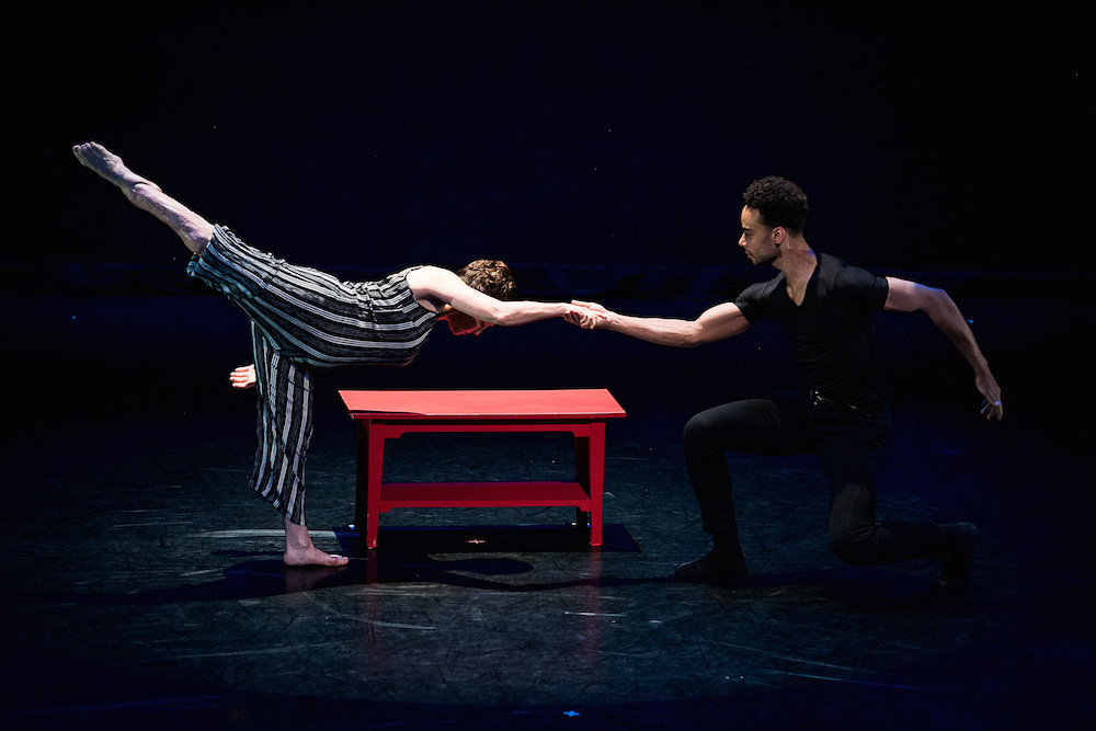 Sitting facing us on a long bench under a bright center spotlight during Christopher Jackson’s Ceremony in the Air, she gently lifts the bottom edges of her flowing pantsuit to, one at a time, uncover both her legs: the left looks as we expect most lower limbs to look, but the right, reconstructed with painstaking care, appears to have been “through the wars.” There is no sentiment expected from Jordan’s leg reveal. We’re not meant to gasp or pity, but rather to appreciate this woman’s reality.