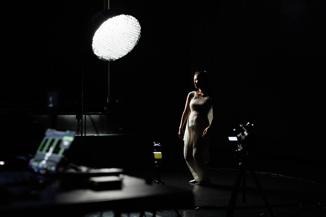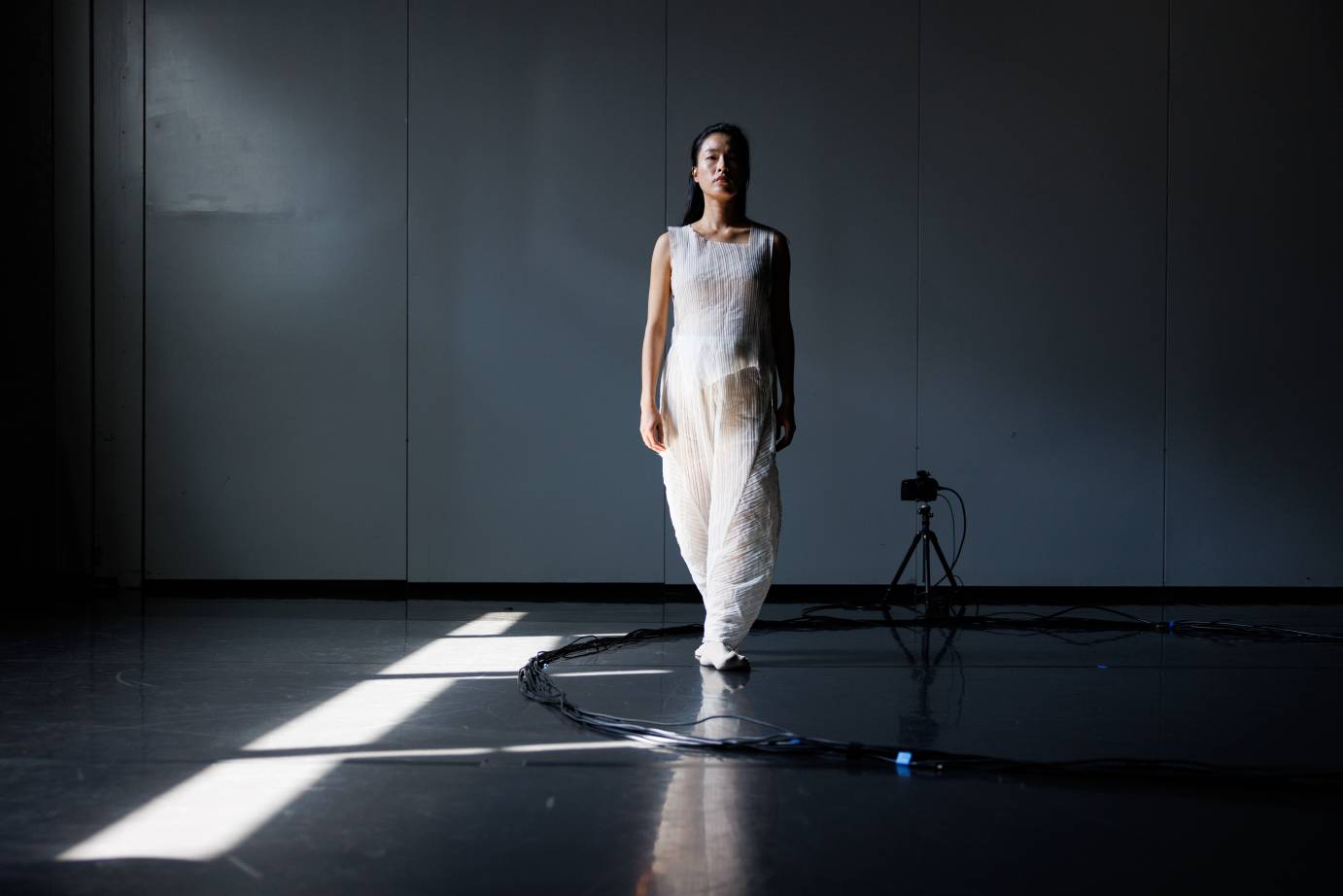 In the studio, Munro monitors a computer that feeds inputs from multiple cameras and sensors through a projector that displays Moon’s live image on the wall behind her. Lengths of black and orange cable snake around the space, bundled together at the center to form a six-foot circle. In this circumscribed arena, Moon unfurls a meditative twenty-minute solo with five cameras as her witnesses. Three cameras perch just outside the circle, aimed at various angles to capture her body up close; two others sit further away to take in the whole scene. Each camera is different, as Munro seeks to evoke distinct connotations — cinematic, surveillance, the everyday — through a range of equipment: older and newer digital cameras, a CCTV camera, and an iPhone, whose static images cycle through an automatic, randomized four-minute loop. Sensors from another phone pick up Moon’s movements and feed them into a wire frame model that tracks points of her body in space; a tall umbrella light with a grid diffuser is cued to Moon’s right shoulder, such that it brightens and dims as she rises and falls. “We’re interested in the body as an input for the construction of space,” says Munro.
