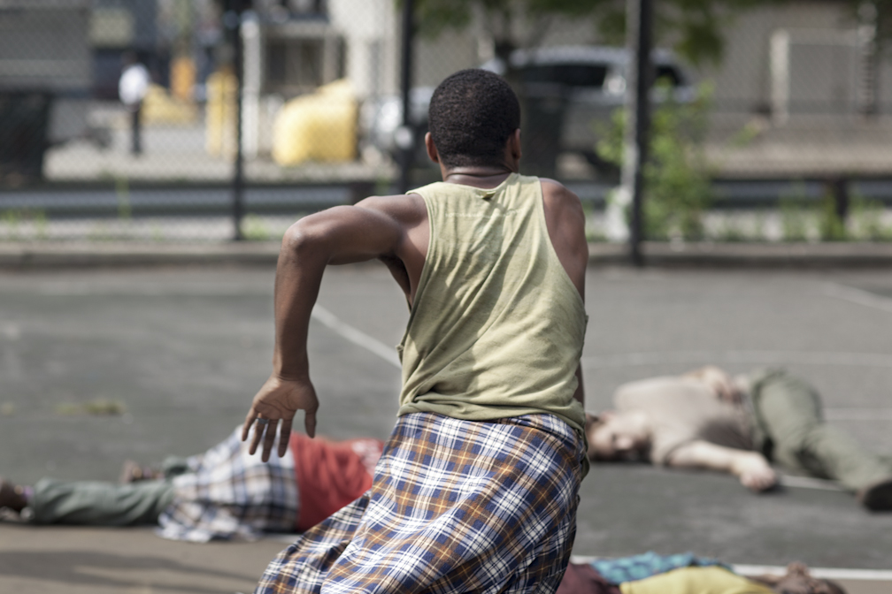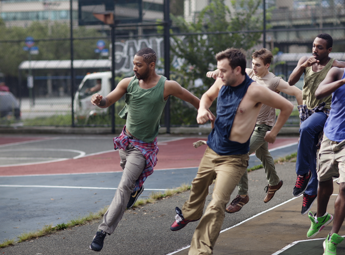 Shots ring out and dancers rocket across the stage. Sneakers hit the ground with a soft thud, thud, thud, and more dancers add their weighted strides to the chorus. A man lies face down, his hands arranged behind his back as if in handcuffs.