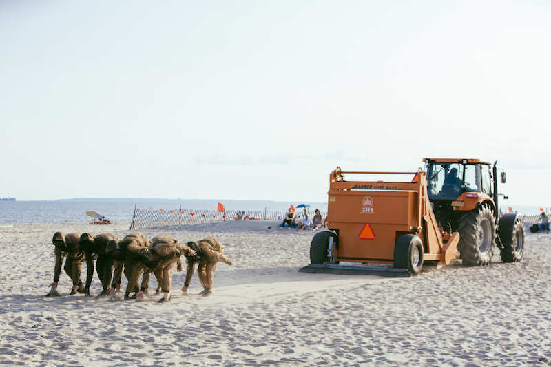 For the 2017 series, one of those artists is Madeline Hollander. In her Arena, a beach rake carves out a circular performance space for seven dancers. Clad in transparent brown mesh body suits, the cast of seven, which includes Hollander, moves as a machine, flicking their arms and shuffling their feet. They cull the sand and systematically disrupt the perfect pattern left in the rake’s path.