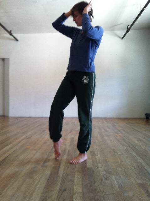 One of my favorite moments during the warm-up is Burley’s simple plié exercise. She asks us to use the room’s length, travelling back and forth, while alternating our facings between sets of pliés. To establish a new facing for every set , we are encouraged to create a transition, a short backward stumble. Each time—and, we do this exercise at least four times back and forth—we discover more and more ways to stumble-- until what was once a small trip becomes a turn, then a hop, then a leap.