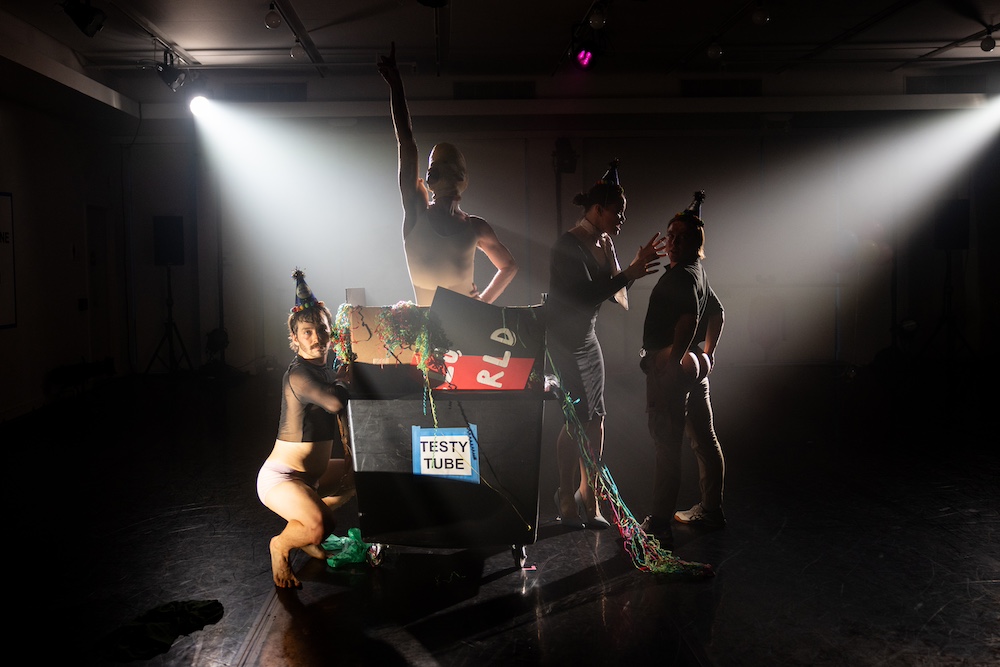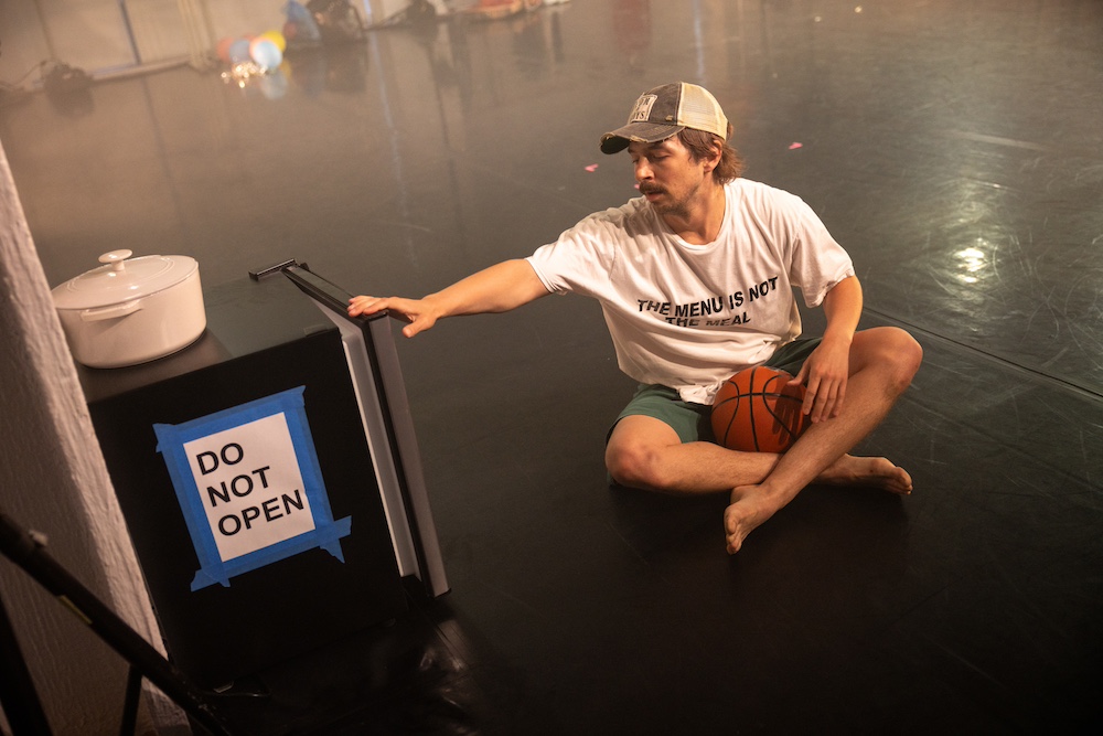 With this foundation, SURROGATE unfolds as a chaotic string of vignettes—one that concerns itself intimately with transitions by largely eschewing or refusing them. Performers creep and rush through the space’s multiple doors in a flurry of cartoonish entrances and exits, with each scene deepening into an acerbic yet beatific sense of camp. As the central character (or characters), dancer Justin Faircloth morphs through an exhausting array of roles and registers. As an auditioning sperm donor, he tears through a melodramatically virtuosic solo with shades of competitive dance; his technical precision and comic timing impeccably ground a parody that is deadly serious. Maddie Schimmel, clad in assless khakis and a Party City polo, joins Faircloth in a clubby duet packed with tightly measured unisons and dynamic partnering. Amid the mess of objects they introduce and manipulate, their steely technicality acts as a conduit to make sense of the body through demand, exertion, and exhaustion.