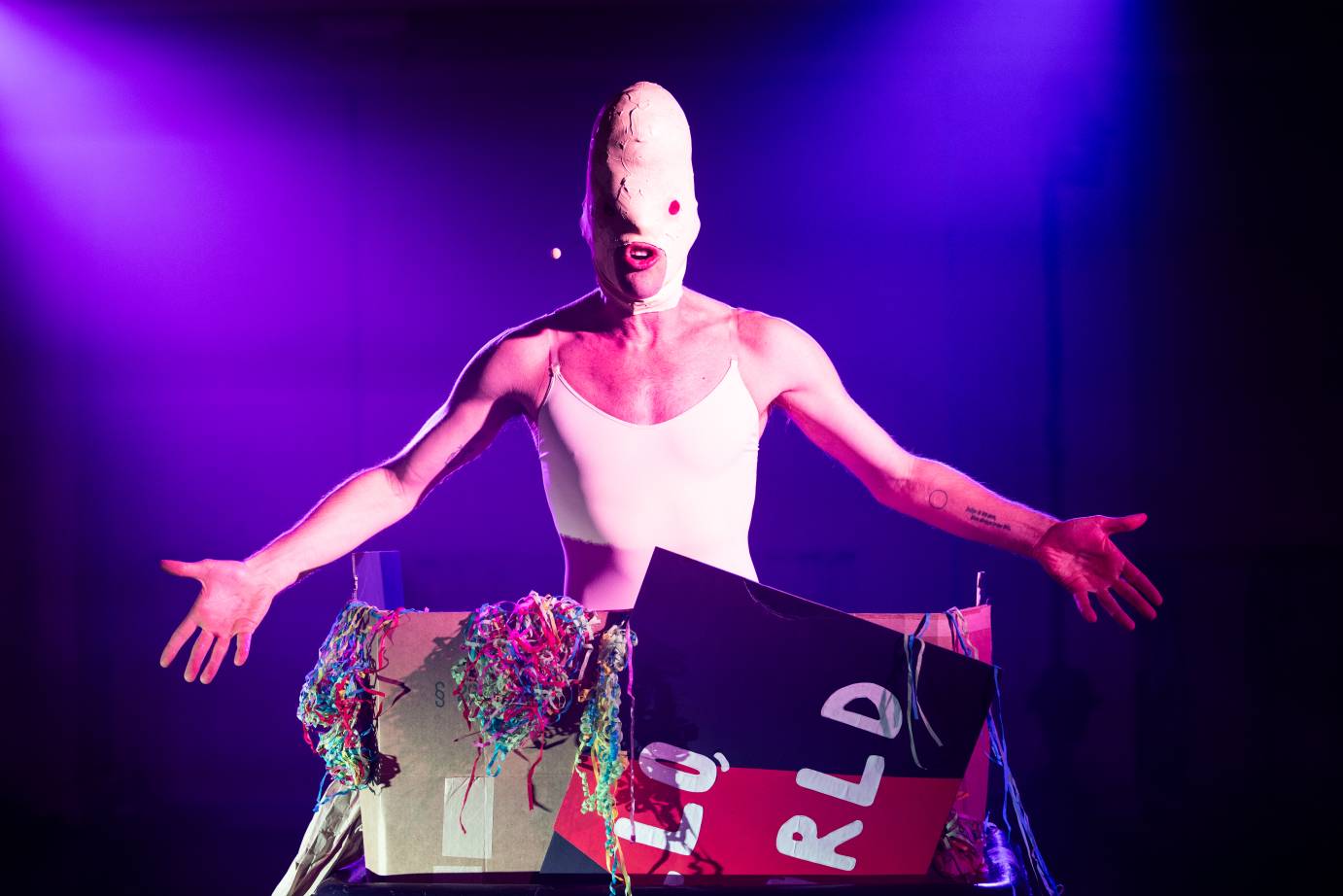 Text and song interwoven throughout the work support and bounce against dance and physical tasks as translations of visceral intuition and confrontations of social norms. Actress Nicola Gorham, sleek and unflinching, delivers a monologue drawn from social media comments and messages directed at Yergens during his very public transition. The barbs stream out of her: rants on toxic masculinity and indictments of queer culture swirl together, her frankness a foil to the anxiety the words generate in the listener. Amid this hyperstimulating rush and tumble, “SURROGATE”’s grand finale comes all too quickly: an original song composed and sung by performance artist Mur, who emerges from a rolling hamper filled with trash. In the surrogacy paradigm they are an embryo with a deathwish, a masked figure of “frozen potential” who yearns for the agency to be discarded and set free.