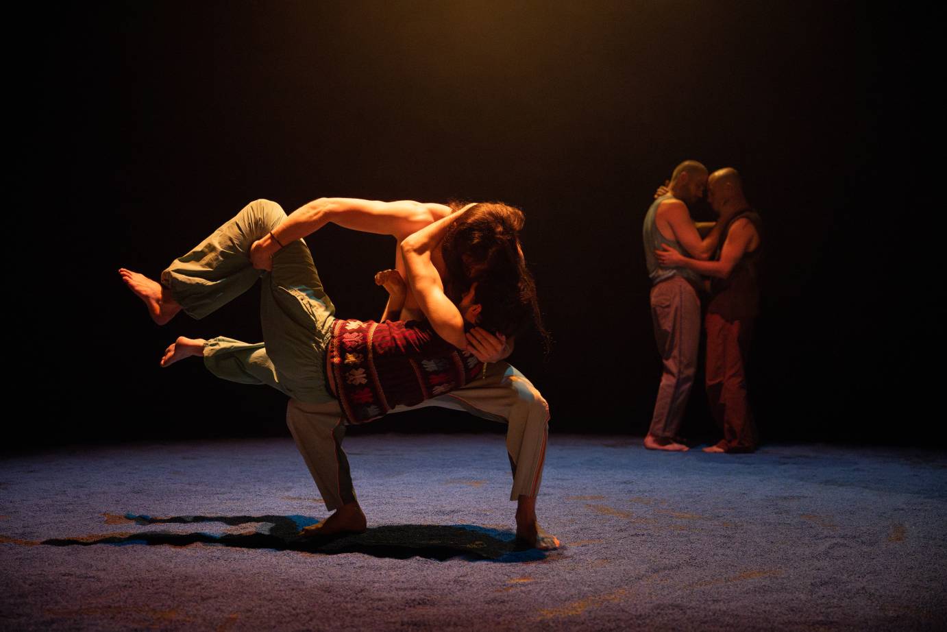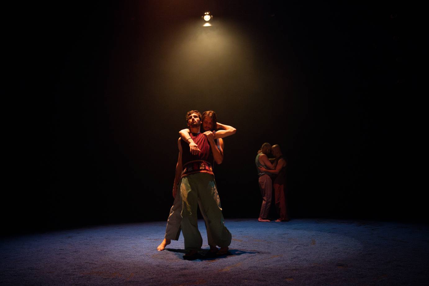 We feel their ecstasy reverberate as they smile, whoop, and exhale. They oscillate between euphoric solo moments and serene group embraces; in moments when they dance alone, the group offers their energy from nearby. A group motif emerges as they huddle around the center, arms wrapped around each other, standing and breathing together.