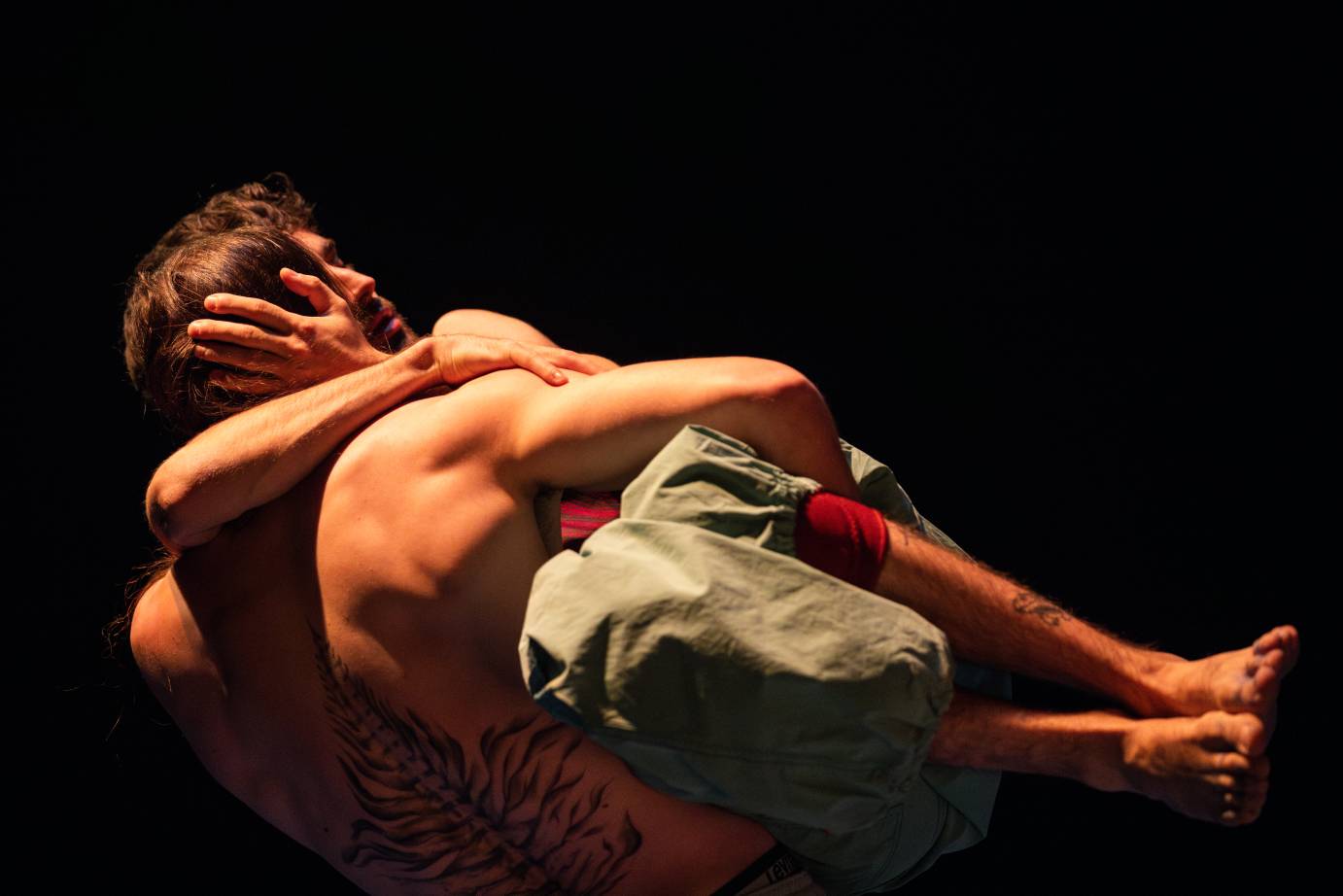 Antoine Berthiaume’s ethereal soundscape shifts from sounds of blowing wind to recorded Gnawa music (Moroccan religious songs and rhythms) which drive the dancers’ impulses. “Gnawa is specifically like a dance ritual,” Mouaraki explains in his interview. “It’s a ceremony that takes place at night, [because that is when spirits are awakened]… the music accompanies us so that as we surpass ourselves, it is like a form of therapy through the dance. And we enter new levels of transcendence.”