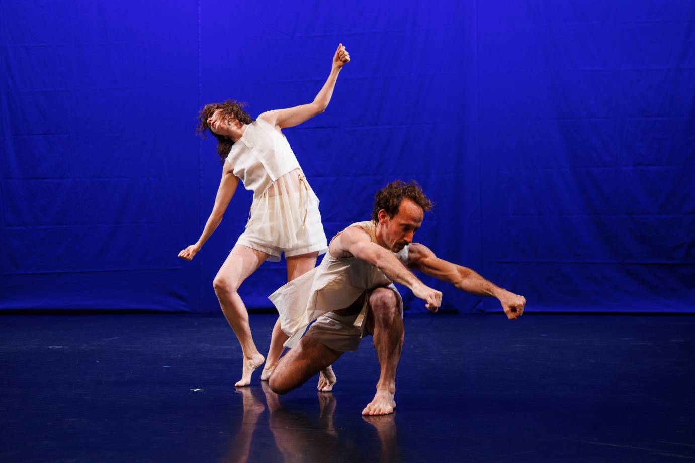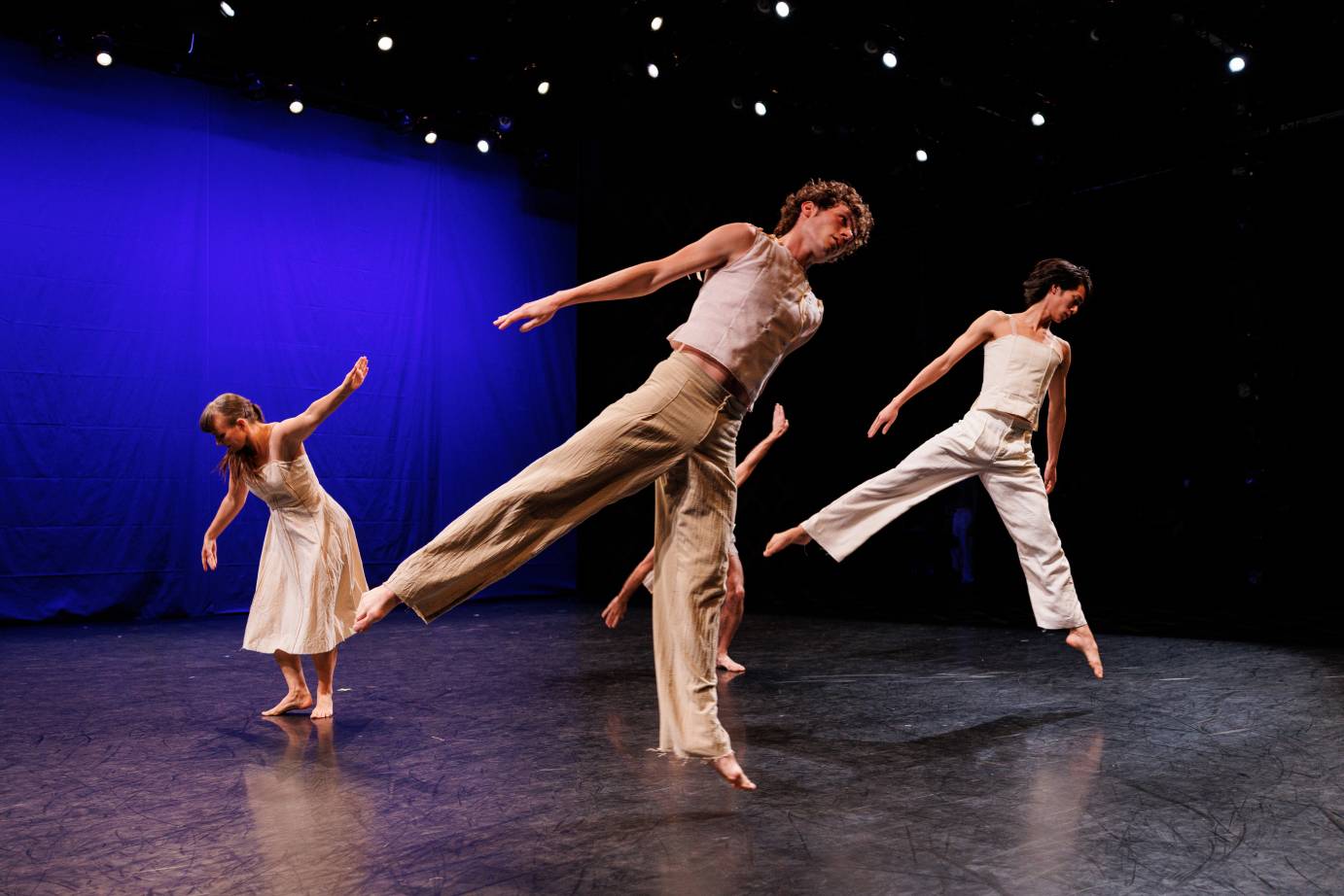Backed by a hum of indigo or a wash of sky blue, they are revealed in clear brightness, their gazes bold and direct, only to shift into a dreamy yellow distance as they turn inward. Their world is an unstable one, equally beset by crisis and tempered by comfort, yet they find assurance in themselves and one another. With soft hands they touch their own bodies, touch the air around them, and reach out to touch each other, tuning their attention through permeable boundaries: inward and outward, self and other, dancer and dance.