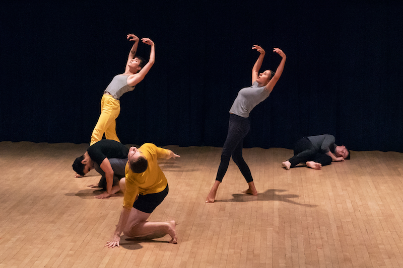 The seven dancers — clad in grey, black and yellow — are agile and powerful. Noteworthy is a solo performed by John Eirich, whose dynamic choices lend meaning to the movement. A long pause at the end of his solo is a punctuating moment within the piece.
