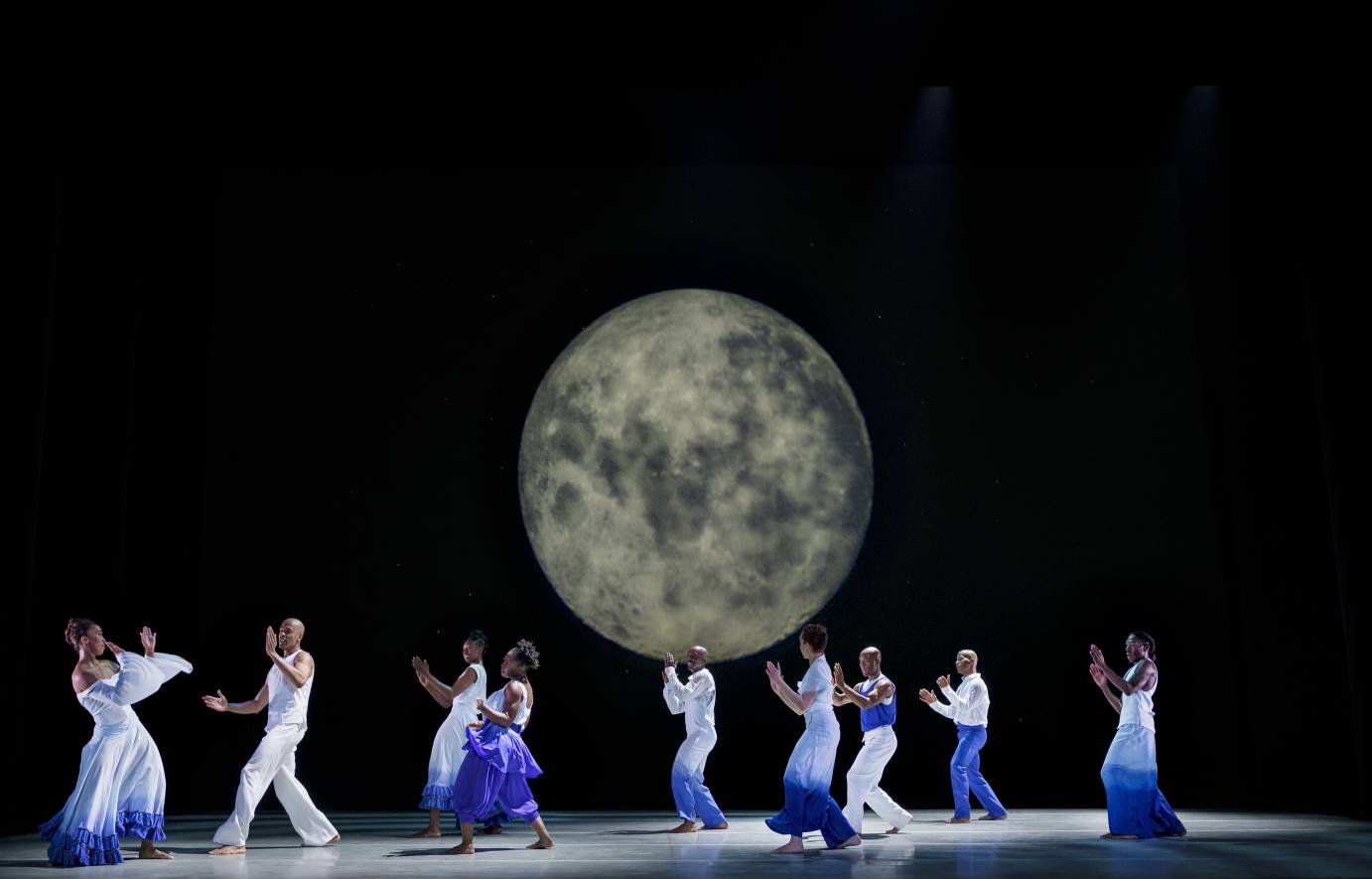 In a breakout solo, Stamatiou twists and dives, flouncing her long, blue-bordered skirt and scooping the air. When a giant moon appears on the backdrop, she leads the ensemble grouped together in a wedge, gathering up her skirts, wagging her finger, clapping and dodging. As is often the case with Brown’s work, viewers may feel the urge to join in.