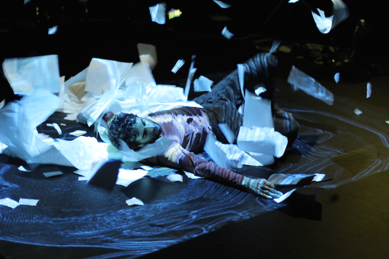 In Murmur (co-choreographed by Odedra and Lewis Major), Odedra, a dyslexic, details his struggles with, and victory over, words by finding meaning in movement. Thanks to technology by Ars Electronica Futurelab, he smudges the letter A on gauzy curtains and wafts along with a video projection of a flock of birds. He recounts discovering an extra A in his first name, which he only realized after multiple glances at his passport. In the climax, a tsunami of paper engulfs him, one that he ultimately stacks into coherence.