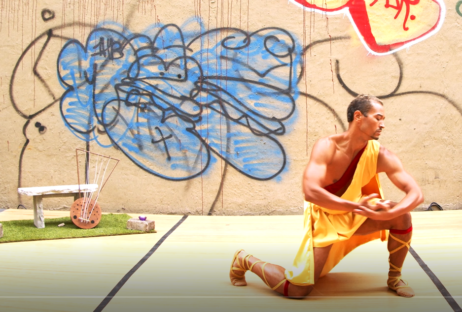 A figure from the mythic past returns in Orphée, both choreographed and performed by Mayzick. As the grief-stricken Orpheus, who has lost his beloved, Mayzick sits on a stone bench with his knees drawn up, sulking and aloof. Stationed in a different corner, Antone Pagán recites a letter of apology from the departed. Then Orpheus adopts a heroic stance, his own gestures buzzing around his head and body in a display of energy. There is nobility in suffering, this solo tells us. When the dancer in his scanty, golden-hued cape contracts his chest, and then throws back his head pushing his arms to the sides, he appears to free himself from psychic bonds.