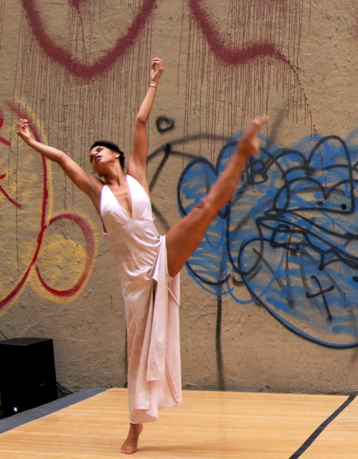 Every day the media taser us, administering fresh jolts of Covid-19 panic. Yet some people who have managed to keep their heads gathered on the Lower East Side, on Saturday, exercising their right to assemble. They were eager to watch the dances that the Alpha Omega Theatrical Dance Company was able to present outdoors in its back yard. This lovely program titled Solo Suites featured choreography by Ari Mayzick, Nathan Trice, and Men Ca, augmented by guitarist and composer Colin Smith, who rounded off the evening with a set of moody ballads. The Brooklyn Borough President, Eric Adams, also made an appearance, giving a stump speech as part of his campaign for the mayoralty.