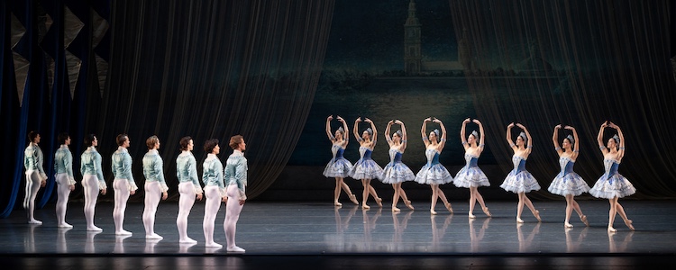 The costumes sparkle in blue and white mirroring the colors of the set.  The men and women bow to each other, and the men extend their right hands, which the ladies accept in unison. After a communal arabesque, every other couple in line step back downstage thus creating enough room for movement. The couples travel across the space together before some break off and arrange themselves in two lines of four couples each, which look like pillars supporting the architecture of the room on either side. Balanchine is not about to explore relationships here and adds eight additional women who repeat an ‘arabesque - port de bras’ pattern that the other women eventually join, but predictably all of the men end up with a woman on each arm. One understands that more important people will be introduced.