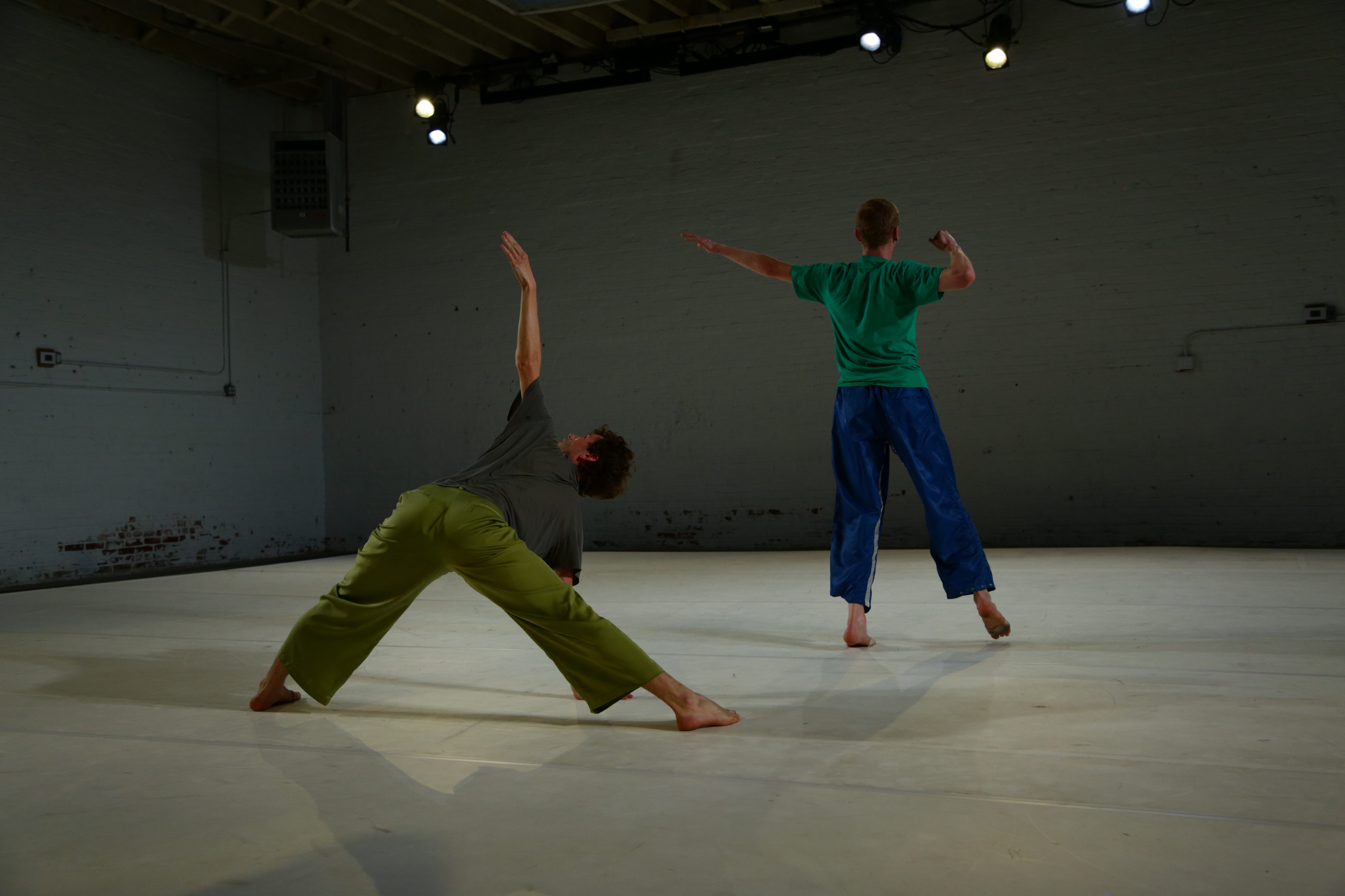 They reprise their rhythmic bounding to punctuate their staggered exit and return to explore new relations of rhythmic and sonic consonance in their breath, channeled through harmonicas. Singly and in loosely staggered harmony, they breathe tinny tones into the blue dim of evening, deep and wistful or high and dreamy, swooping or spinning to alter the sound with their whole bodies. Bertucci’s score joins in with reverberating layers of harmonica, plaintive and airy, metallic and organic. Like their earlier footfalls, the harmonicas lend embodied sonic depth to their movement, opening another dimension to sense how their bodies show up and affect the space around them. They exhale tones as they stride and pause, recede and brighten, leaving shadows and soundwaves in their wake.