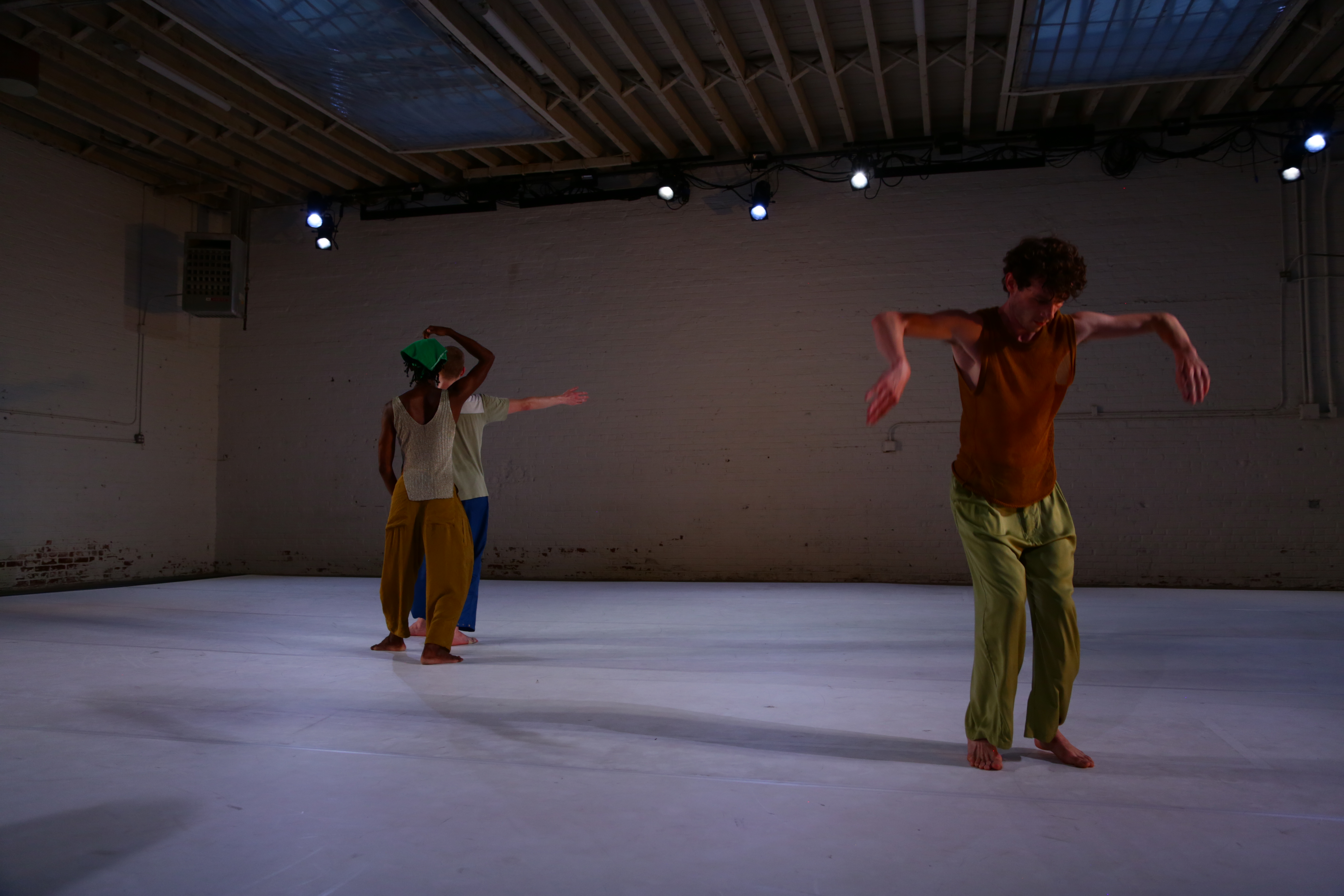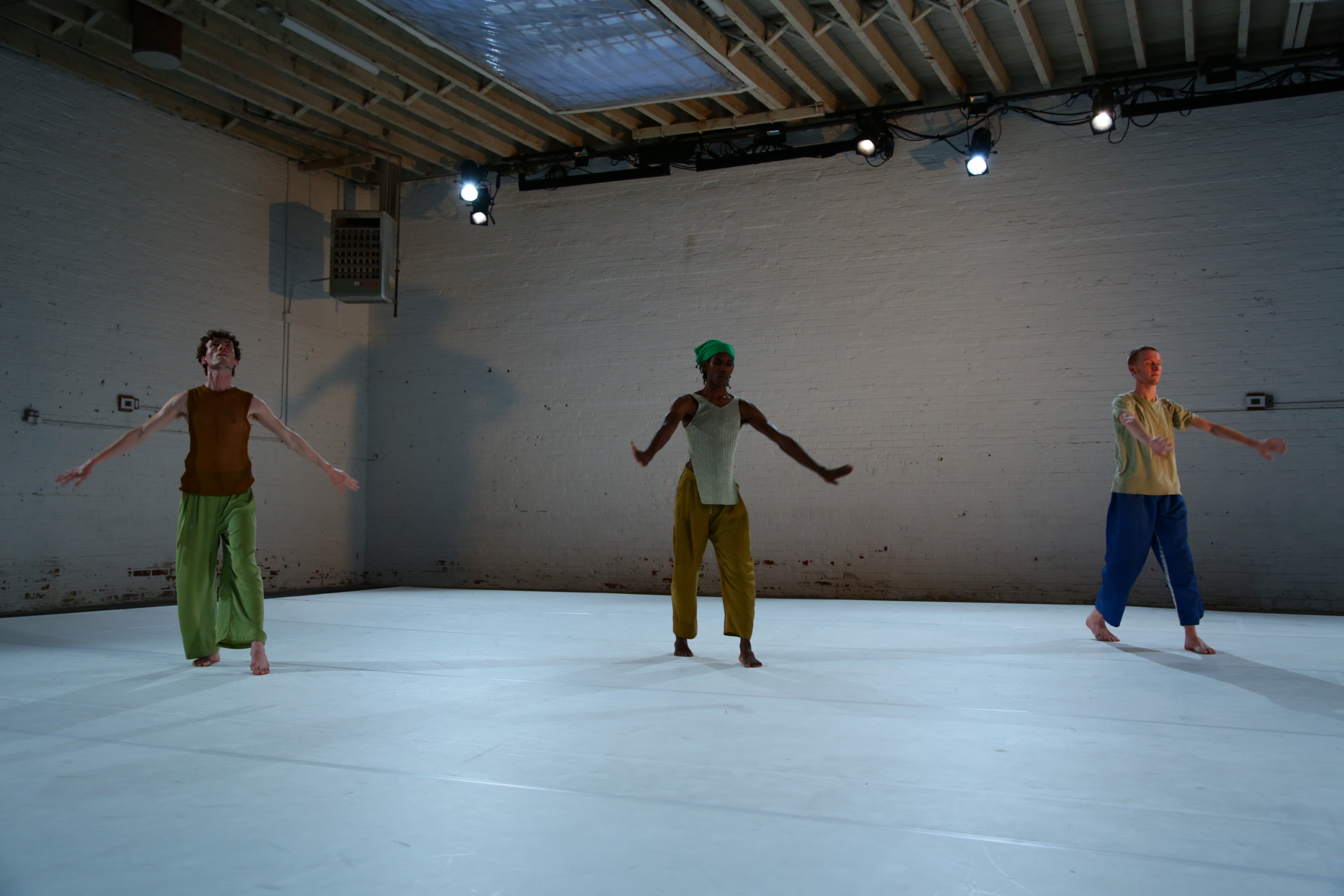 The performers are generously transparent in their cycle of inward feeling and outward looking — a directness of presentation amplified by our shared lighting environment. Gazes remain patient and open, thoroughly mutual in recognizing the inherent confrontations and possibilities at play. Vulnerability and support emerge as themes, as when Bendernagel and Prum kneel across a short distance and alternate folding into each other, one’s head coming to rest tenderly in the other’s lap. Exercises in trust abound as the three traverse the space in a cluster, falling with plunging fists and catching with cupped palms; later they interlock arms and lean back to send their small circle into a vertiginous careening of calibrated tension and shared momentum.