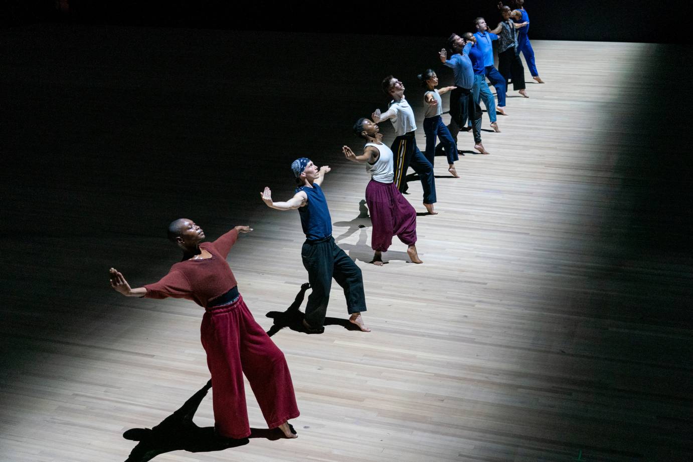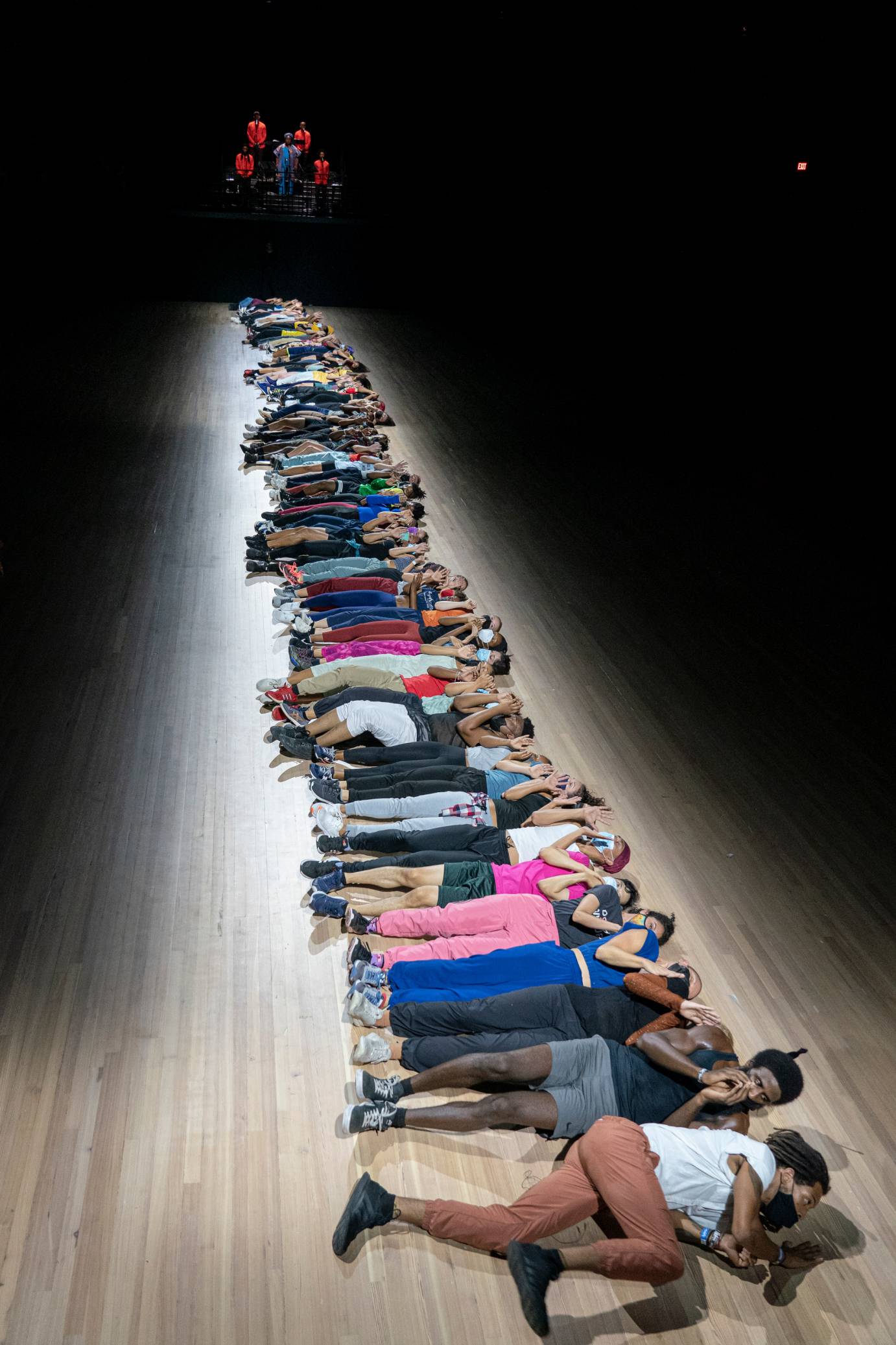As disciples re-enter, three are immersed in a choral song leading the group into a crescent formation. Strewn across the floor from lying to standing, all are connected by touch, reaching toward a distant future we cannot yet see. They line up along the edge of the stage. The first disciple leads the second into the space, and they begin rehearsing segments created by Jones. The second calls for reinforcement “I need you!” When all the disciples have joined, one shouts “Are you satisfied?” The rest respond “No!” and rush to a different location in search of refuge. This continues as Bill T. Jones lists the names of Black civil rights activists who were either assassinated or banned from history books because they were "a problem." Projections of red splatter across the floor.