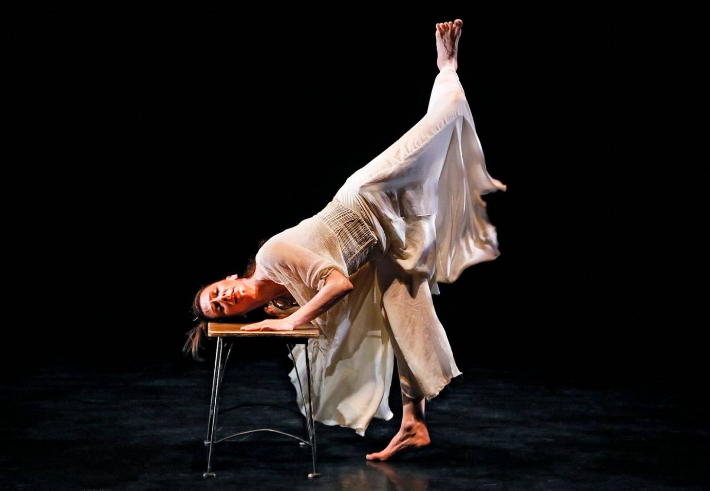 Though we can tell that she is lying along a steady bench, Blakely White-McGuire, in Bare to the Wall Suite, appears to hover in mid-air. She extends her limbs outward, swimming in space, and then, with a startling gasp, pulls her hands to her open mouth as if recalling the presence of a lover who’s gone, but still very much a part of her. Her limp body hangs over the bench; her feet lead her in a panicked circle around it; a flexed foot drags the bench with her as she attempts to travel forward. How will she survive with only memories of her love and this bench for support?