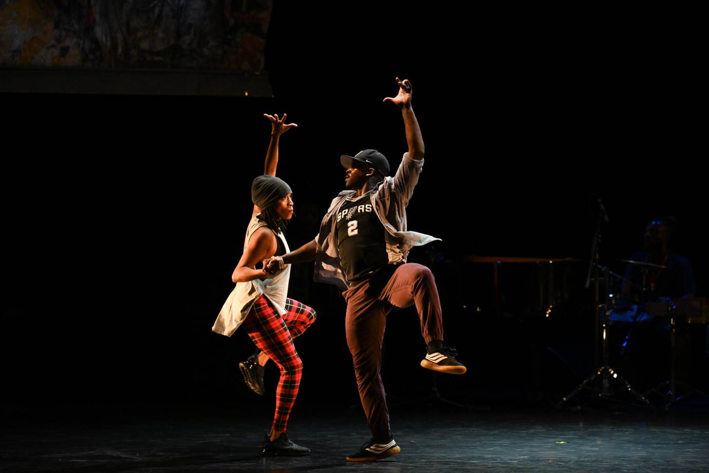In the program notes, Brown explains that “the seven sections of ink represent superpowers of spirituality, history and heritage, the celebration of the Black female body, Black love, brotherhood, exhaustion, and community.” These superpowers manifest in the Black vocalizations of joy and connection; in the Lindy Hop partnering; in the whipping of African-American tresses and the expressions of brotherhood; in the carving of space with wrists and fingers; and in the moments of pause, where one couple of female- and male-presenting dancers hold each other—eyes closed, breathing heavily.