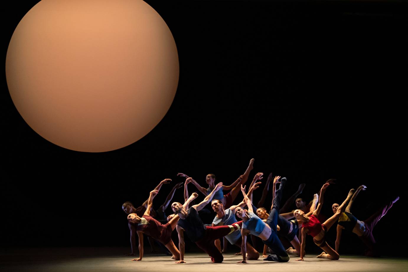 A single, giant disc that occasionally changes color hangs suspended at the back of the stage. At times, it feels as if a supermoon smiles at the follies of humankind. Stories unfold in ever-changing groupings. A leg swings at the head of a dancer who ducks to avoid being hit; and another dancer catches the rotating limb before it strikes his chest. When he tries to push the leg away from him, it won’t move at first, and it takes another more serious effort to send it back in the direction it came from. Can you tell I am hooked? It’s physical humor at its finest.
