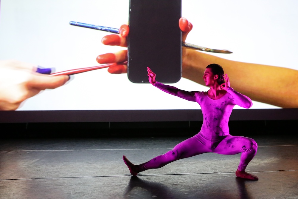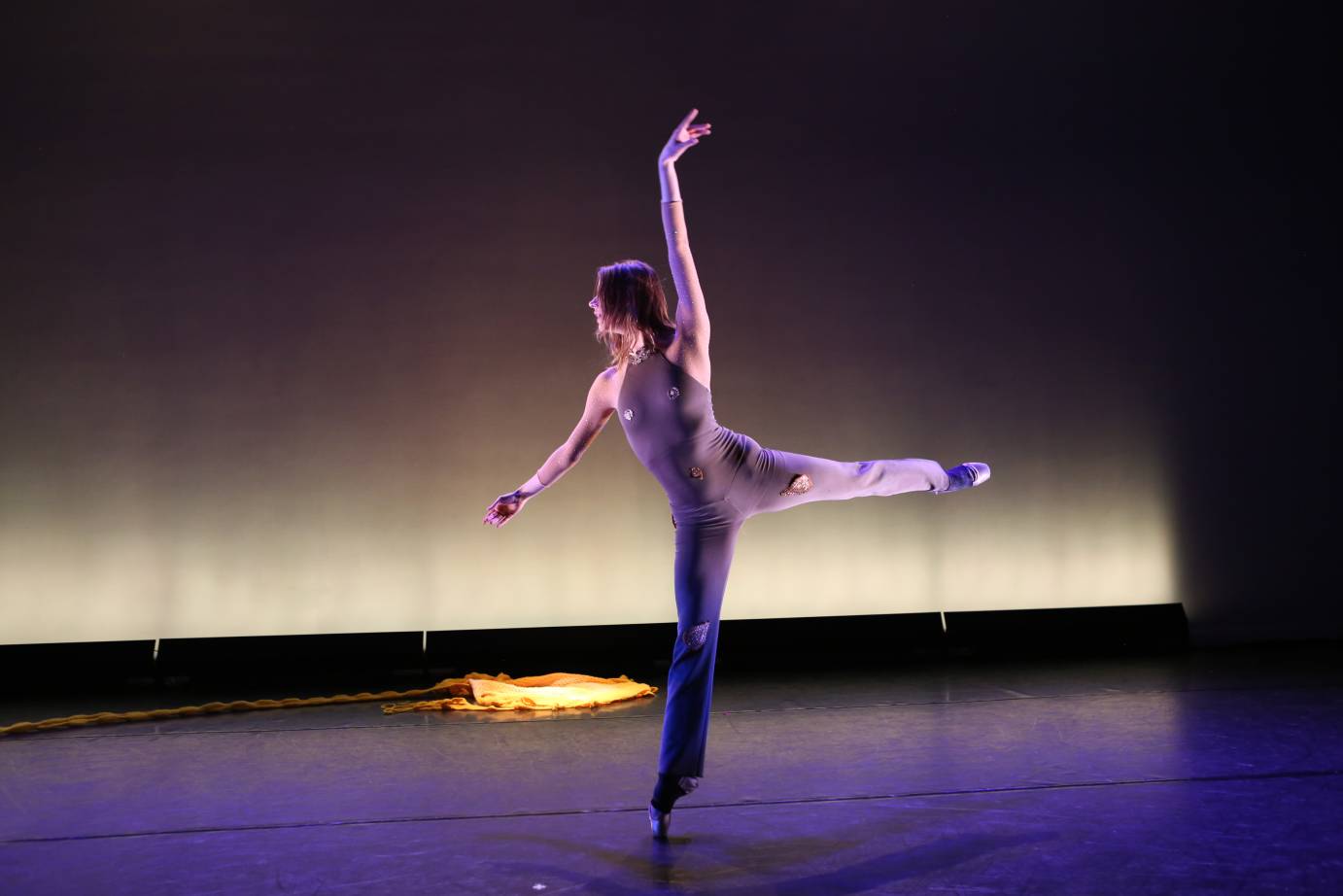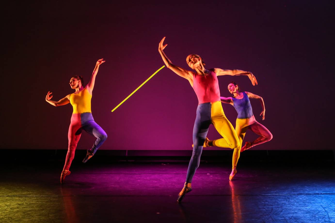 Prism, a spritely trio by Taylor Gordon created with visual artist Gaby Collins Fernandez, brings a vivid palette of yellow, pink, and cobalt. These hues are highlighted through three fabrics that the dancers move with; through their costumes and pointe shoes, painted in variations of the three colors; and through projections (primarily of triangles, as well as shifting, abstract shapes). The performers’ sharp movement qualities are arresting, and capture the quick rhythms of Fernandez’ abstract sound score.