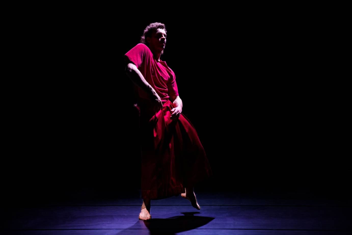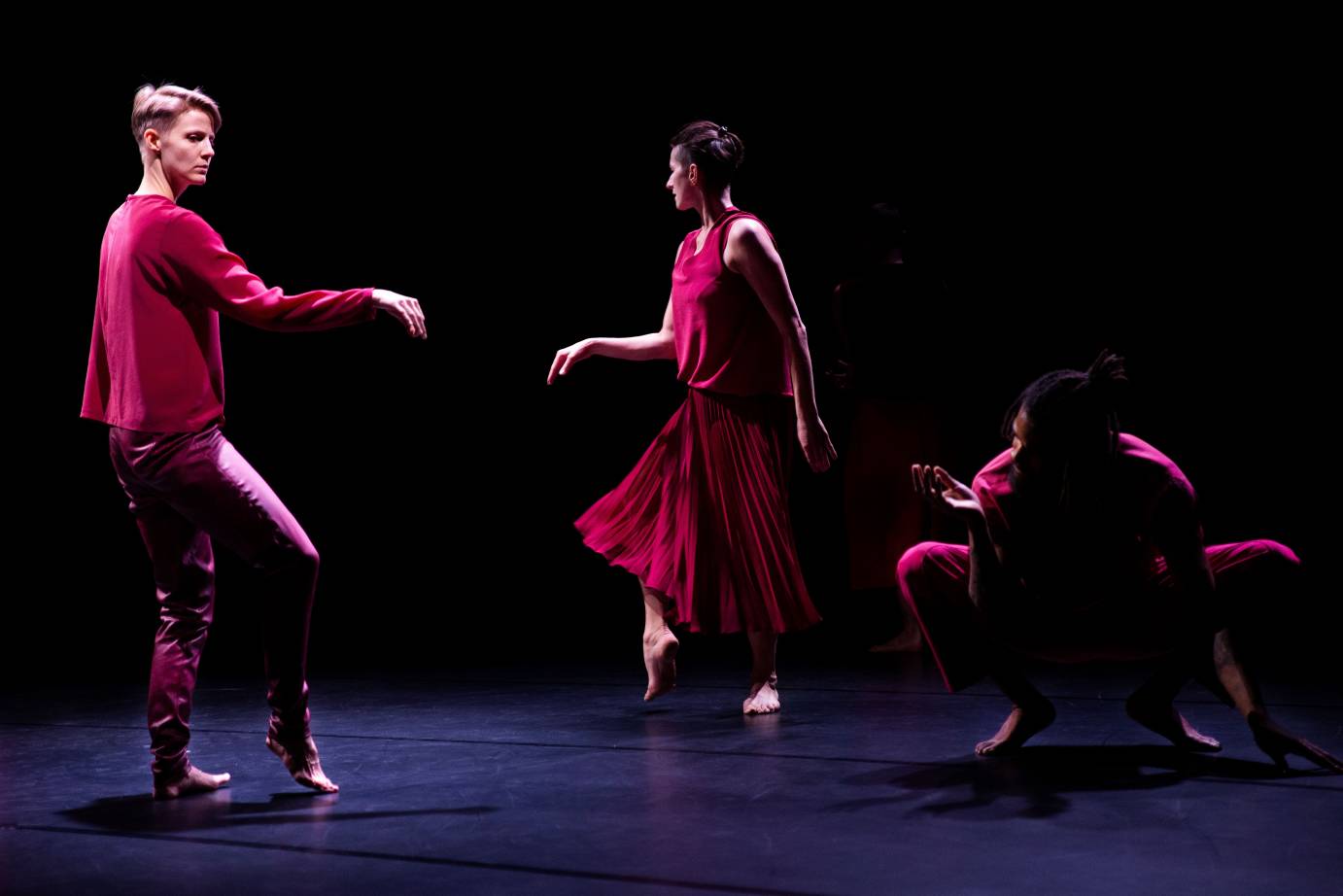 The mise-en-scène is also fragmented. Graham Reynolds’ music rumbles one minute and resounds the next, sometimes evoking a rainy day. Minna Tiikkainen’s lighting brightens and dims erratically leaving parts of the stage in shadow, and interjecting an abrupt flash of light and sudden blackouts. Similarly, the dancers pause without warning, retarding but never halting the overall flow of movement. Only Behnaz Aram’s crimson costumes (in individual cuts and styles, to be sure) hold things together. This intermittency keeps us alert for surprises. The uneven rhythms of Horse, the Solos are those of lived experience.
