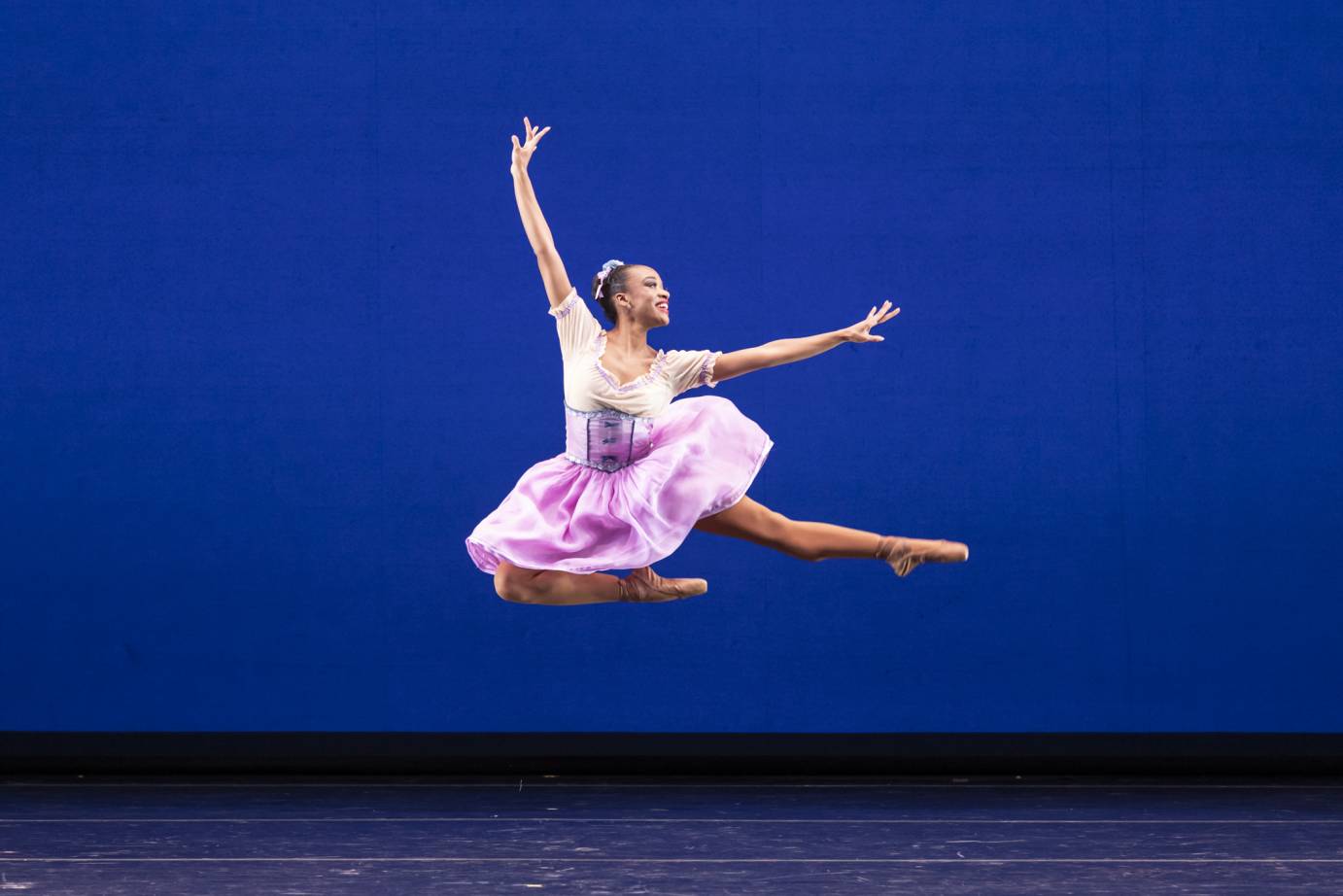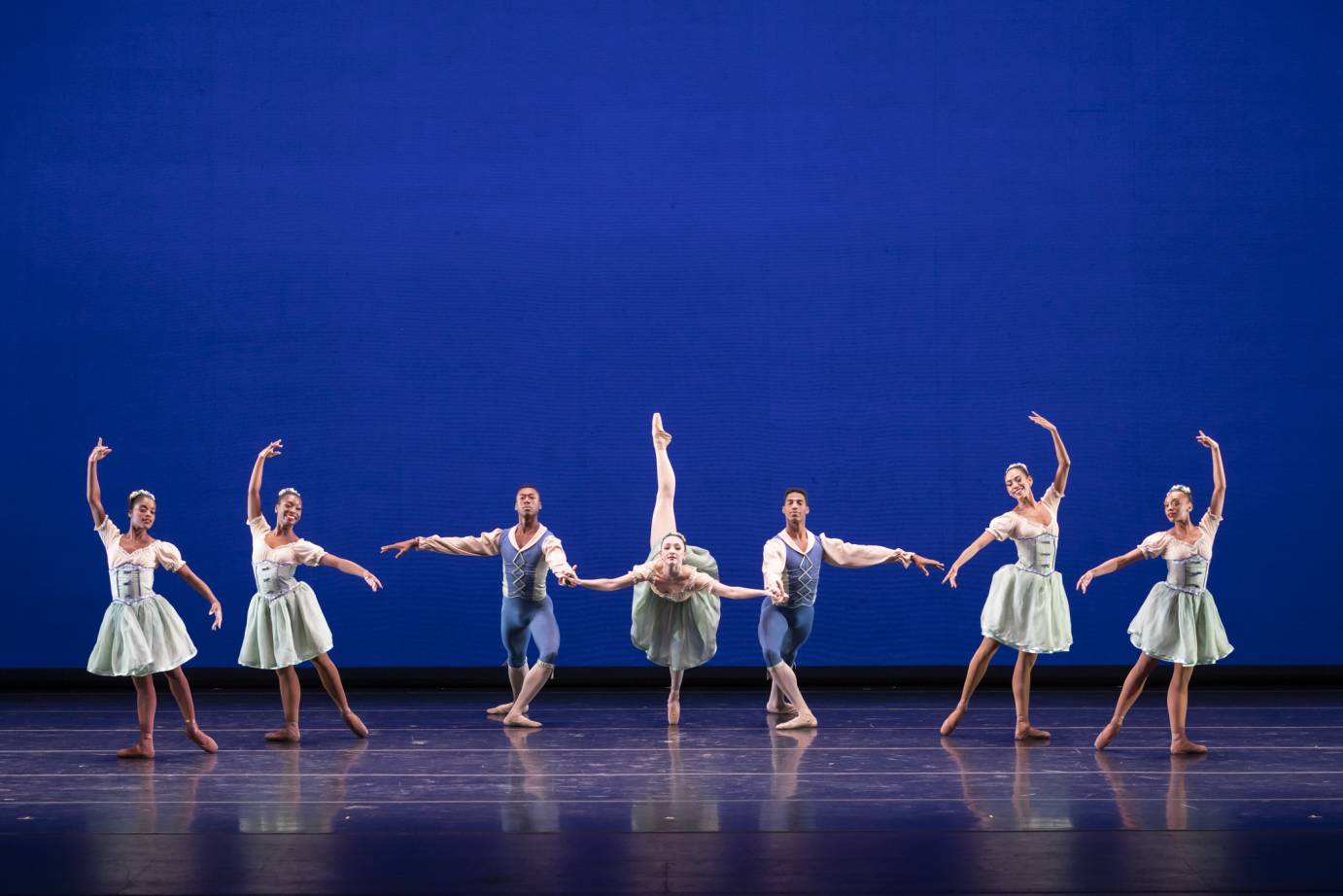 This gag may be seen as a half-hearted apology not only for the choice of music, but also for the grand-standing of the ballet’s principal couple, who are stars in that good-old ballet way that knocks out the viewer’s head-lights. Yet Balanchine isn’t sorry. He seems to enjoy the barnstorming more than anyone, coming up with new “tricks” to wow the crowd — like the series of little air-turns that the ballerina performs in her partner’s hands, landing neatly on her pointes. Thanks to Balanchine’s economy, all the steps seem to have air around them, so that despite interweaving and the inevitable farandole, the footwork possesses astonishing clarity; and each ensemble member stands out.