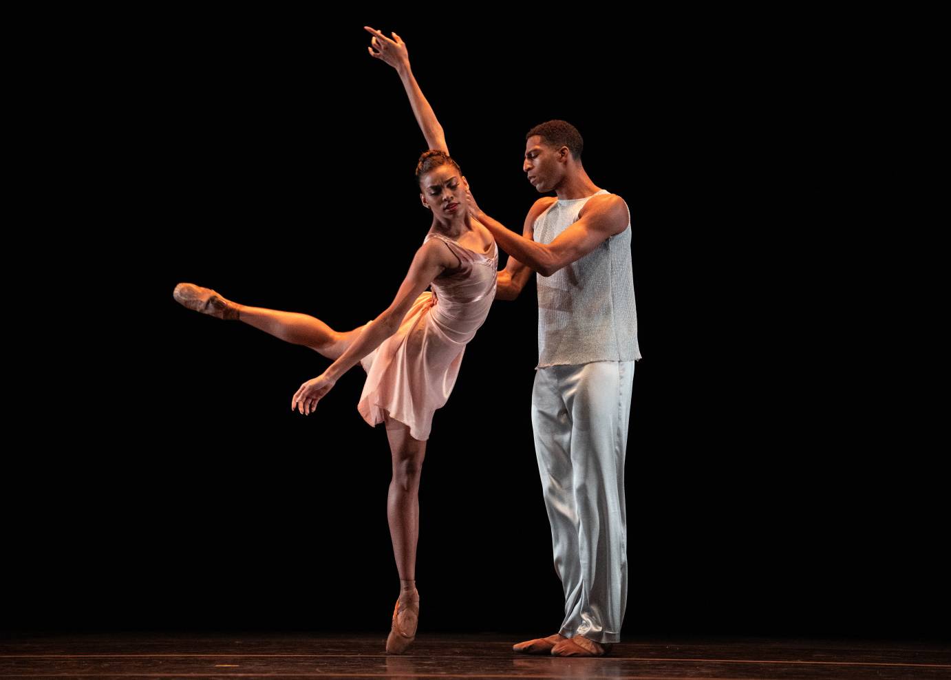 Physically challenging and expressive, Passage of Being manages to be showy, despite the dappled lighting and a moody, electronic score by Ryan Lott and his band, Son Lux. Kamala Saara and Derek Brockington are the principal couple, their recurring duet featuring spectacular lifts, with the ballerina thrown over his shoulder or launched into space only to return and wind herself around his body. At the end, however, Saara finds herself without a partner, flinging herself into space and breathing hoarsely while the others gather upstage behind her. The music has stopped; and Saara’s only companions appear to be memories.