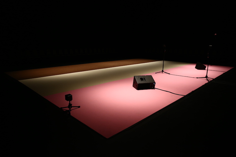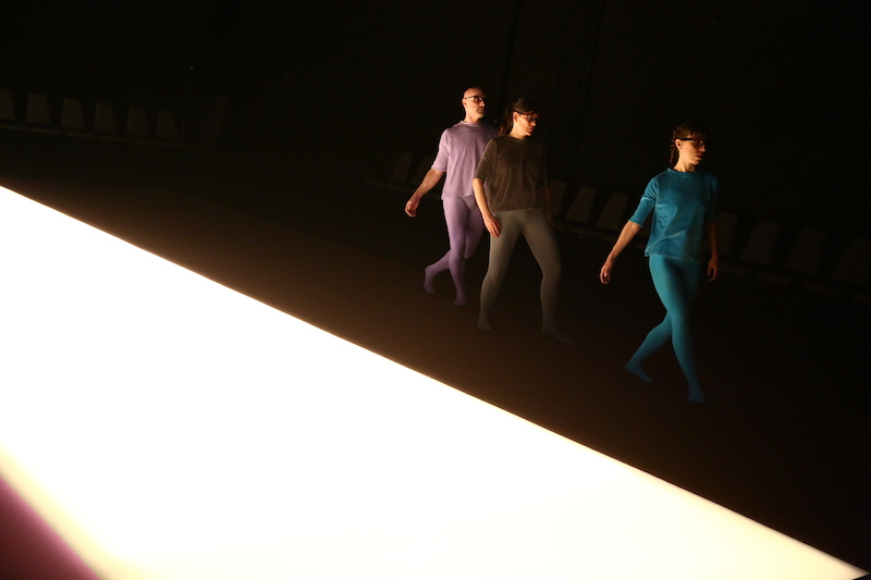DD Dorvillier/human future dance corps try to work around this in Extra Shapes at The Kitchen. She and two dancers (Katerina Andreou and Walter Dundervill) execute a seventeen-minute sequence three times as concurrent but independent music and lighting compositions unfold. The audience, who is stationed around the perimeter in a single row of chairs, moves to a new seat each time. The artists seem to be enacting an experiment: By switching location, do you experience these seventeen minutes differently? Or do you relive the same seventeen minutes over and over?