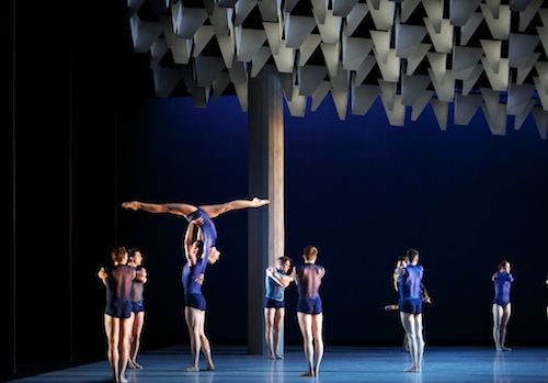 While highly abstract, it was accessible through its beauty and elegance. Double-hued leotards in shining variations of blues by Yumiko Takeshima were elegant on these dancers’ beautifully sculpted bodies. Martin Boyce’s giant pillar served as a reminder not only of the Olympics, but of the Greek gods and their temples. I didn’t catch the significance of the lighting sconces hanging from the ceiling pointed toward the stage like paper airplanes, but they were beautiful.