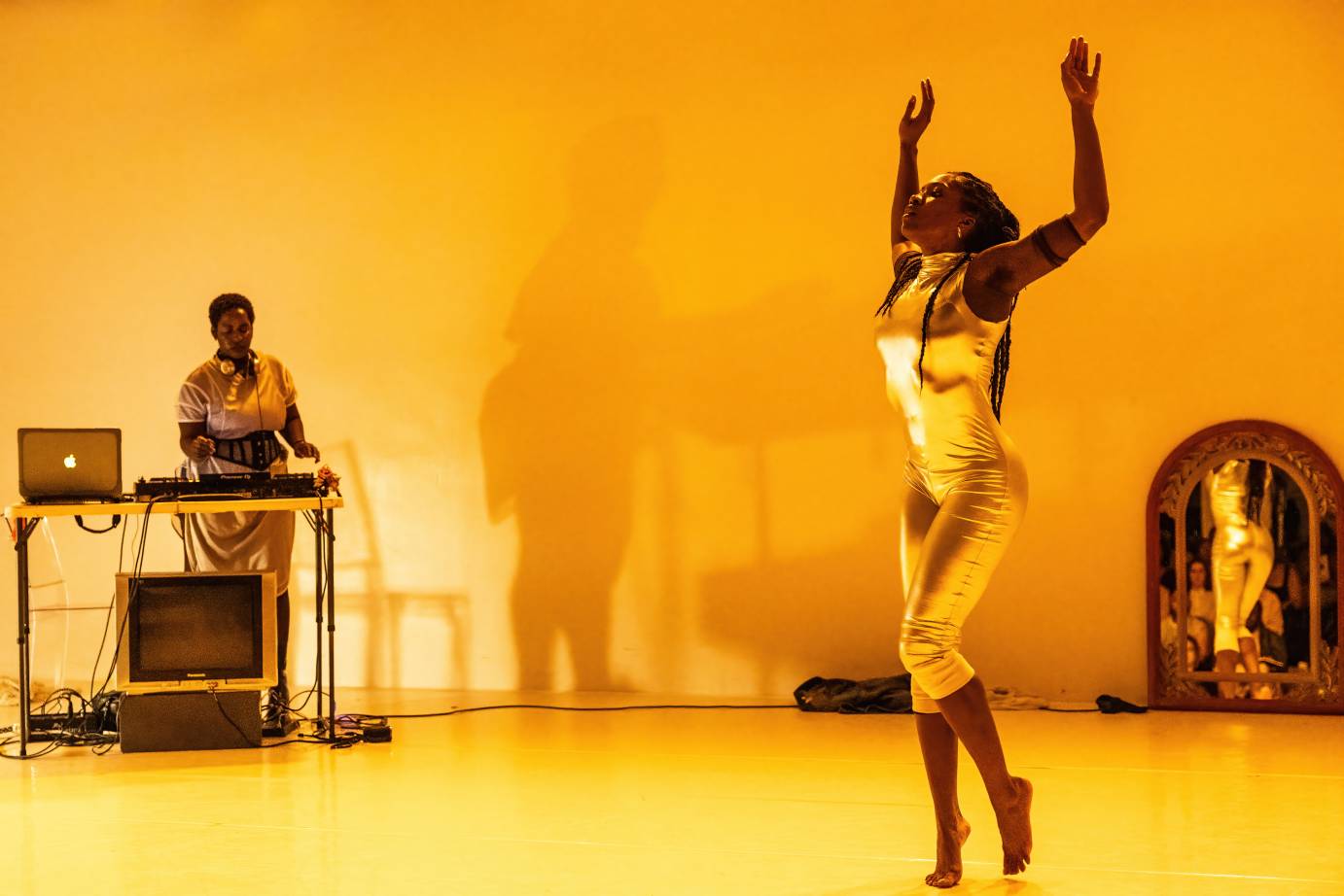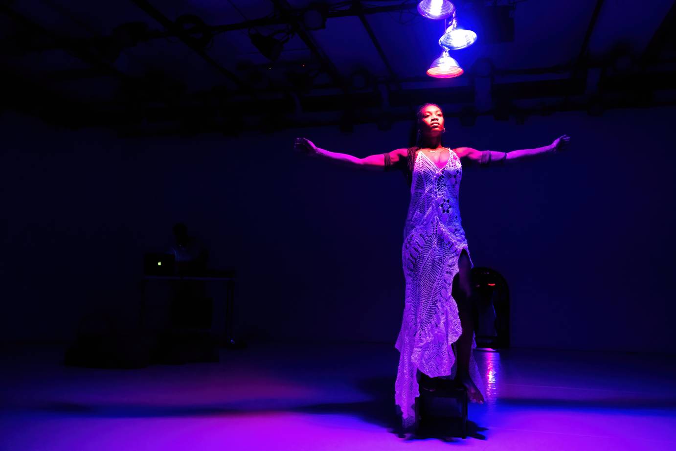 Upon entering the larger space, Kneaku Ashae pulses house music from a DJ set. A performance artist, Nailah Murray, sits in front of Ashae, her back turned to us — remarkably maintaining this orientation for almost the entire 90-minute performance. The room holds a curious mix of domestic and nightlife articles: a mirror, a clothing rack like one from a bedroom closet, a ceiling lamp with a white crochet dress hanging from it, and another lamp suspended in the center of the studio.