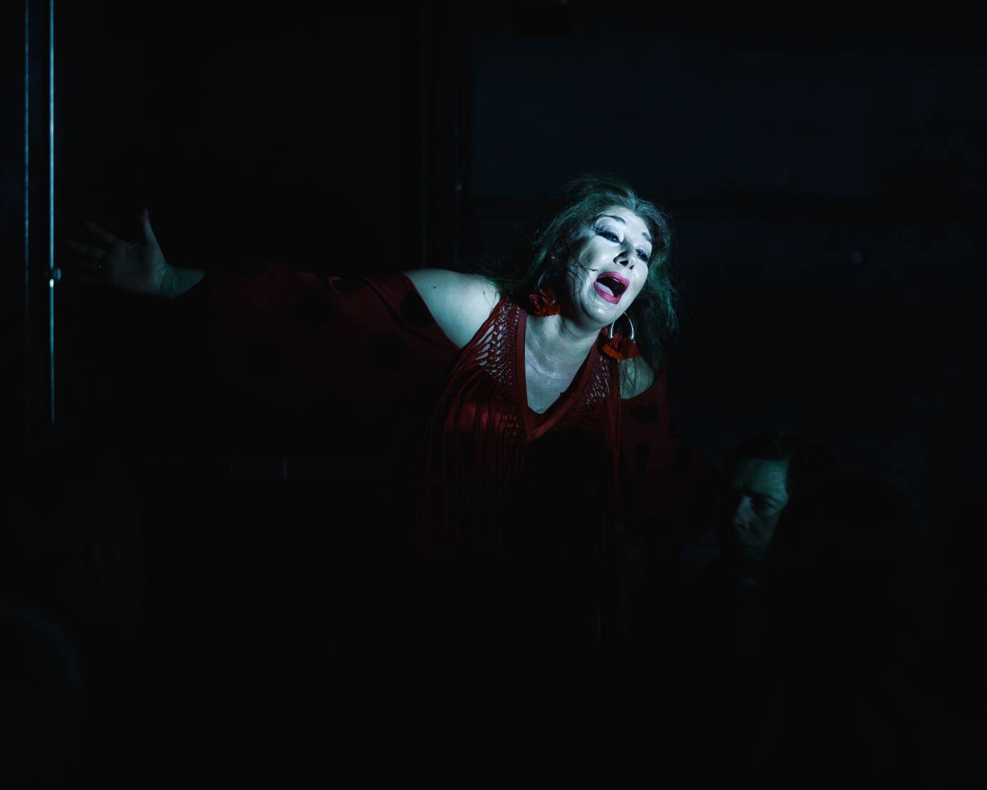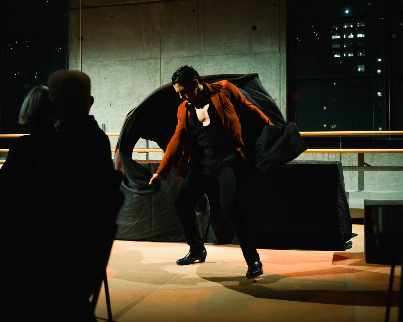 Initially, the audience gathered around the six performers, who faced each other around a table, as if in a conference. Suddenly, the mood snapped from cool to hot, as one by one, the artists performed Bulerías, the festive solo dance, with their body percussion and gestures reaching to the heavens. Each segment performed thereafter took us to a different part of BAC’s 4th floor Howard Gilman studio, with its wall of glass displaying NYC's resplendent lights.