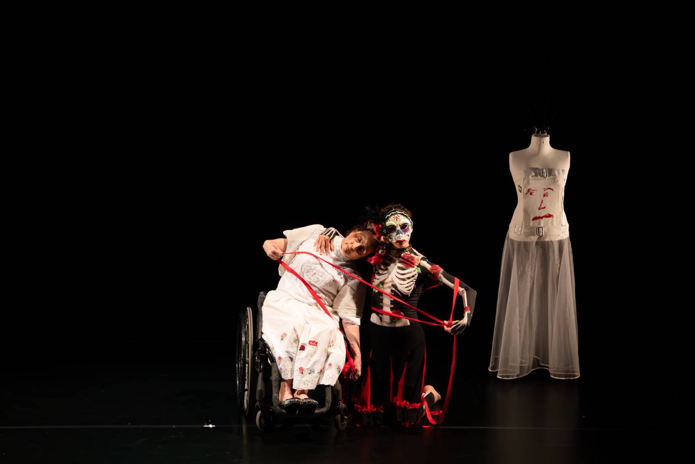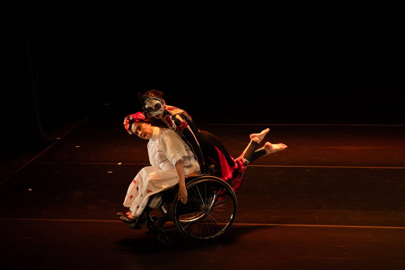 Frida Kahlo and the Dance with Death opens with Righeto, a non-disabled dancer and artistic associate of Infinity Dance Theater, dressed in a skeleton unitard and glowing Day of the Dead mask. With stomping feet and staccato gestures, she establishes herself as the archetype of Death, reminiscent of the figure in Kurt Jooss’ The Green Table. Despite her slight frame, Righeto commands her role with fierce attack and strength. Influences of Graham and Limón techniques are visible in her controlled contractions and the interplay between weight and buoyancy.